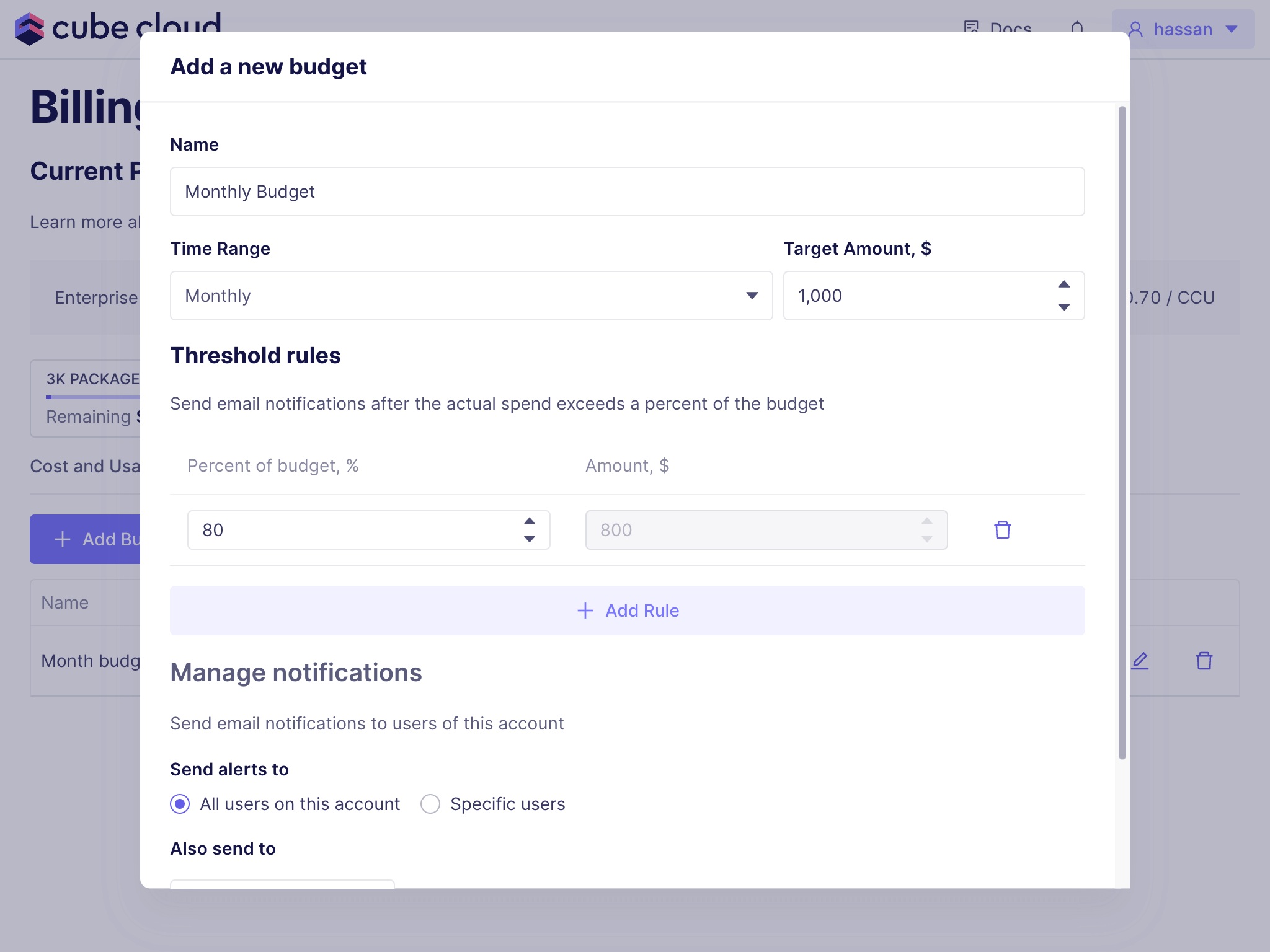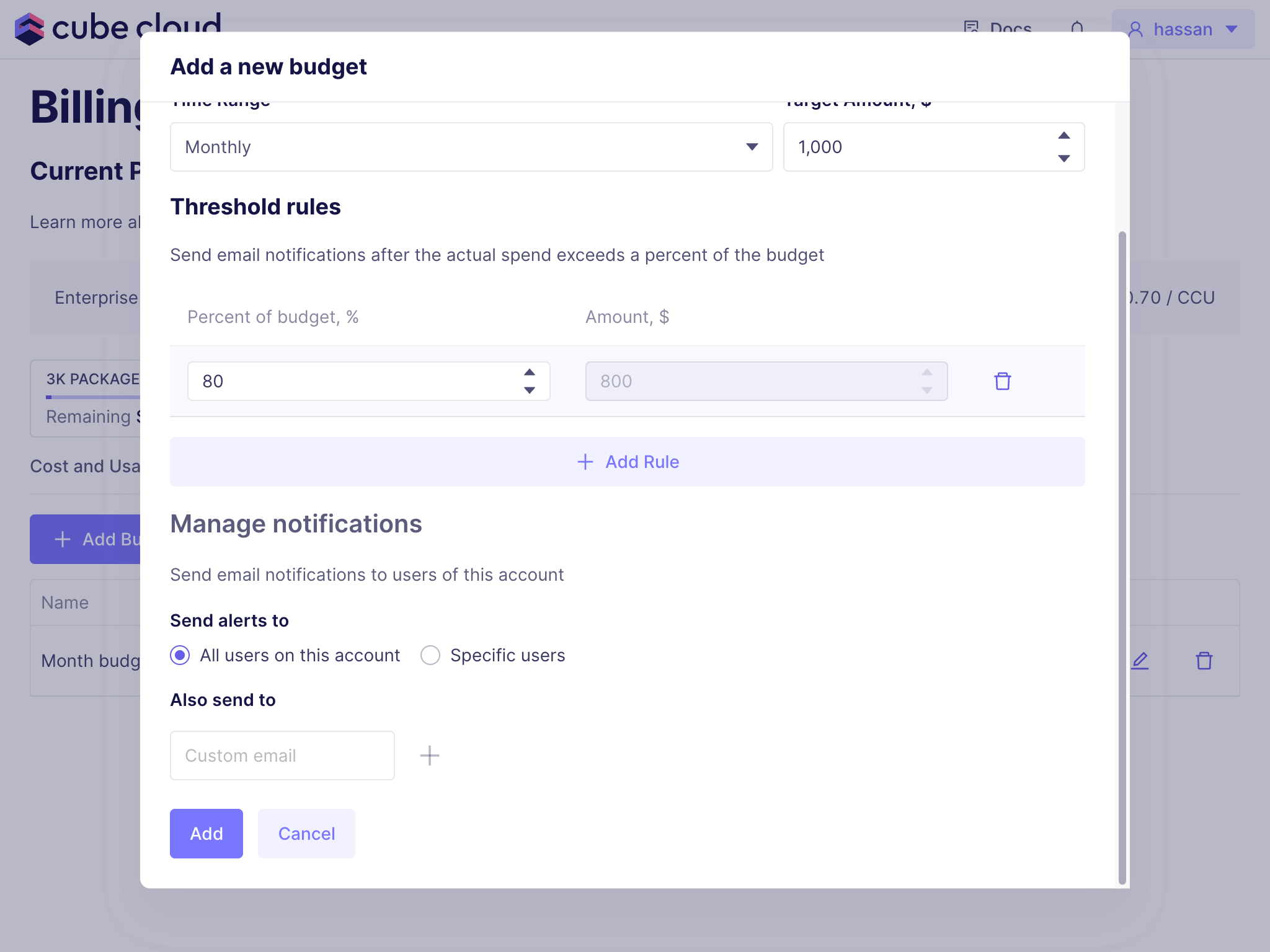 To create a new budget, click the Add Budget button. Enter a name for the budget, then select a time period (either ‘Daily’ or ‘Monthly’) and a corresponding target amount, which is the amount of usage that will trigger a notification.Threshold Rules