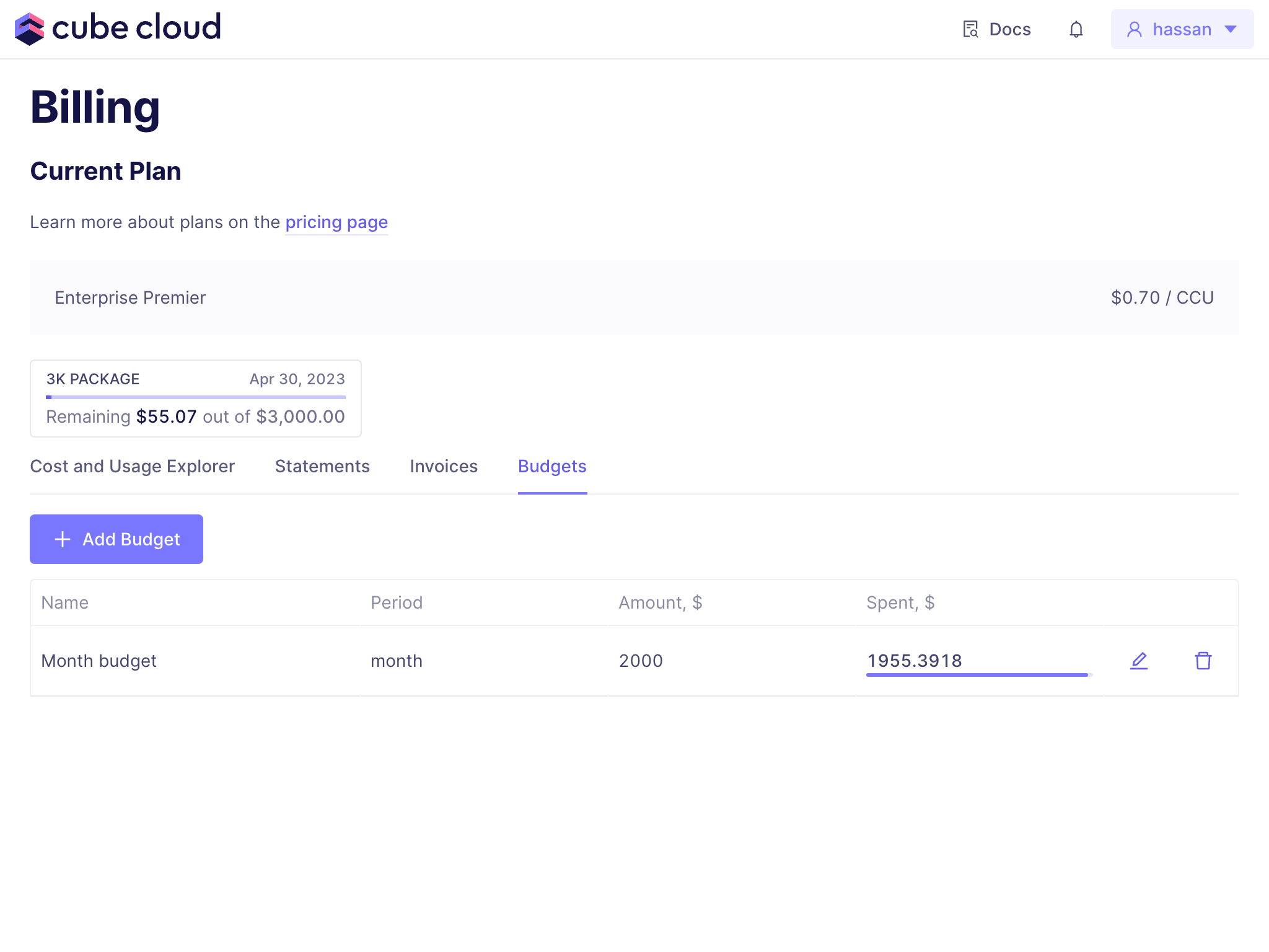 Budgets are configured on a per-account basis. When a budget is triggered, any configured users will receive an email notification. Budget notifications are sent immediately after being triggered.List all budgets