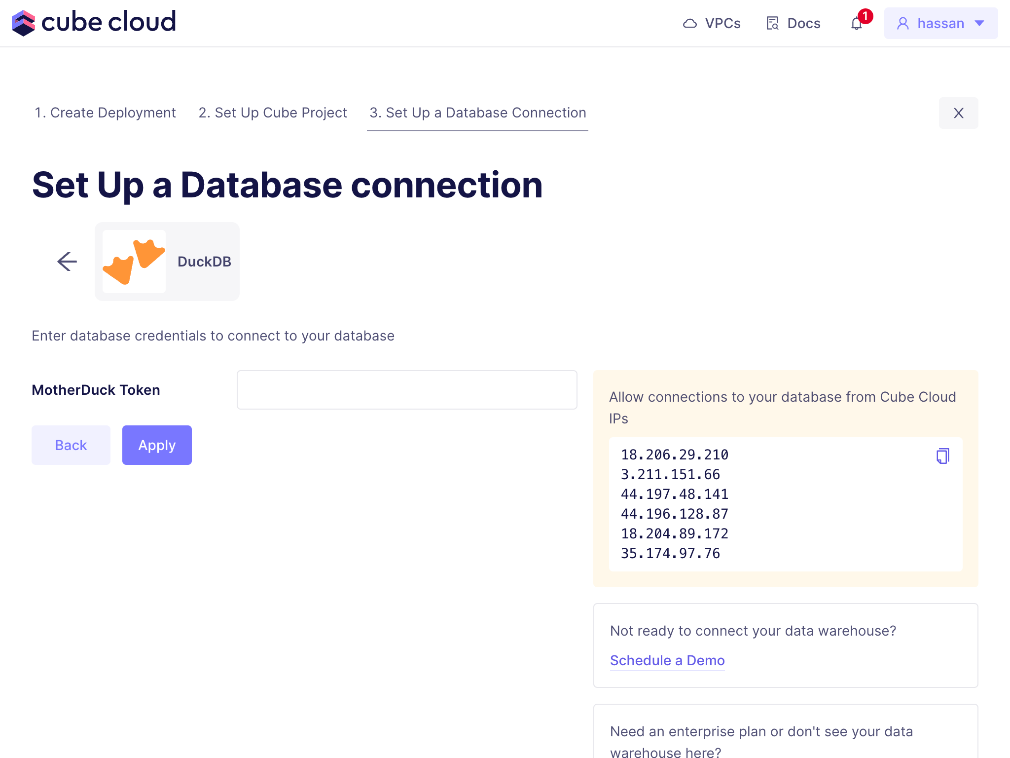 In Cube Cloud, selectΒ DuckDB when creating a new deployment and fill in the required fields:If you are not using MotherDuck, leave theΒ MotherDuck Token