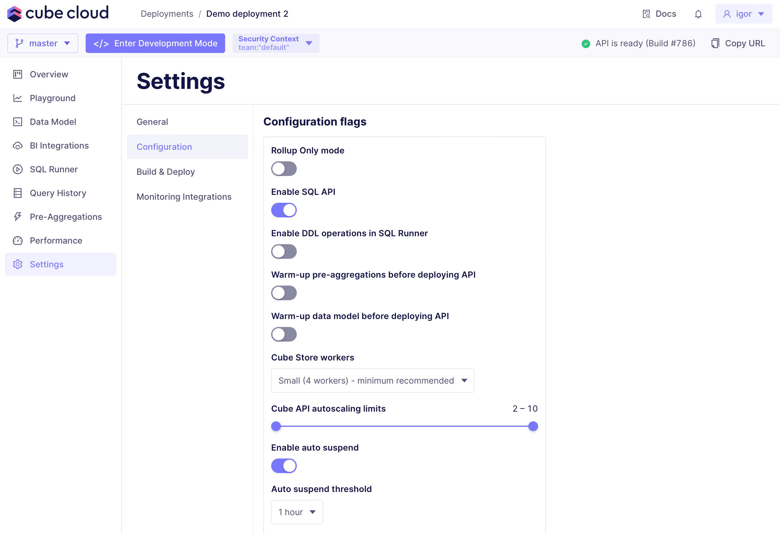 To enable auto-suspension, navigate to Settings β Configuration of your Cube Cloud deployment and ensure that Enable auto-suspend is turned on:Resuming a suspended deployment