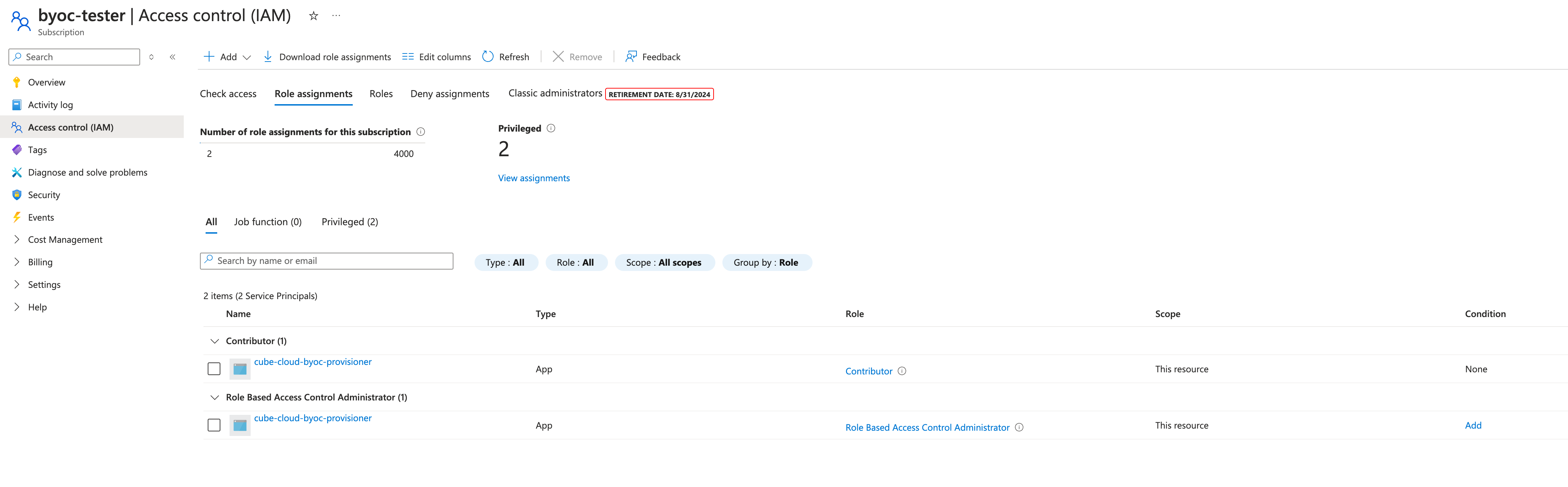On the Azure Portal, go to Subscriptions → Your BYOC Subscription → IAM→ Role Assignment and assingContributor and Role Based Access Control Administrator to the cube-cloud-byoc-provisioner