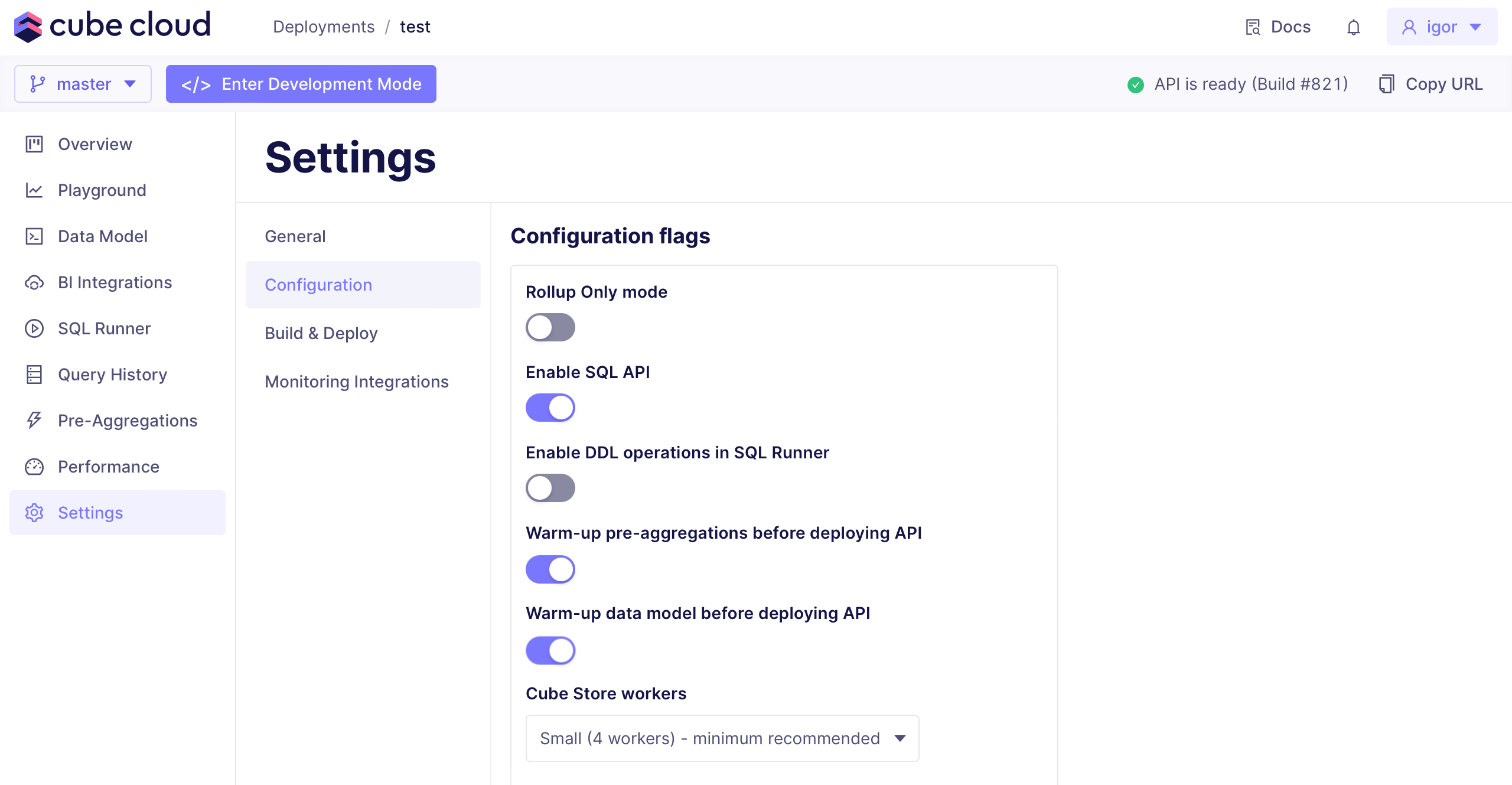 To configure data model warm-up, navigate to Settings → Configuration and enable Warm-up data model before deploying API:Pre-aggregation warm-up