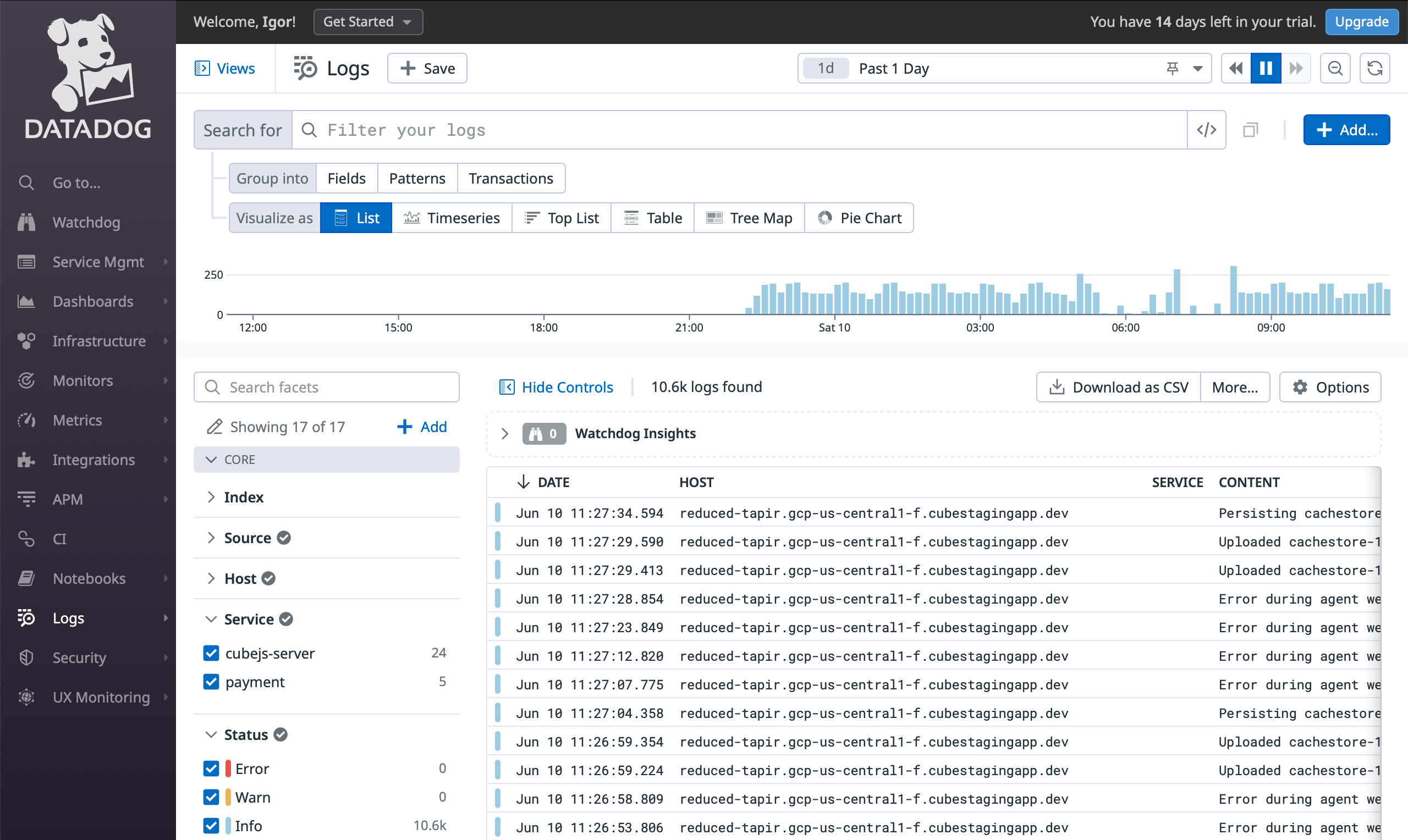 navigate toΒ Logs in Datadog and watch the logs coming: