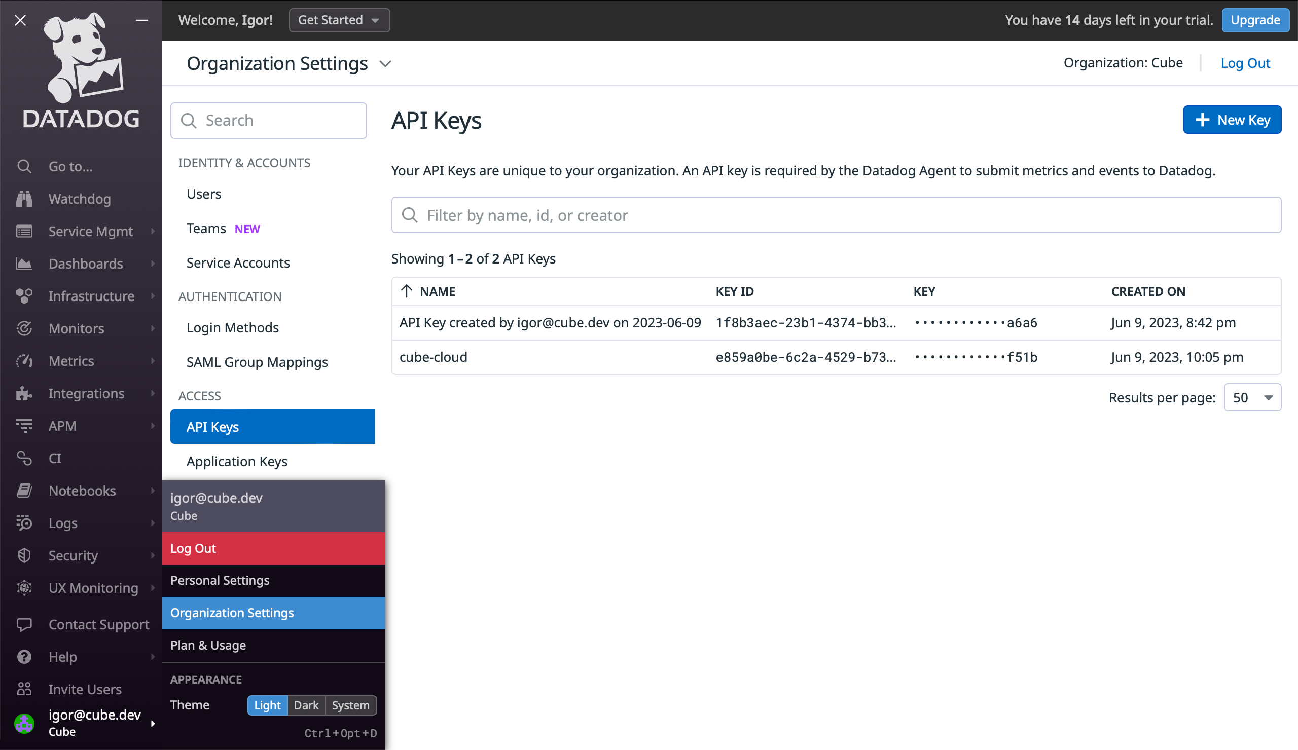 To export metrics to Datadog, use the same API key from Organization Settings β API Keys as configured for logs. Then, configure thedatadog_metrics sink in your