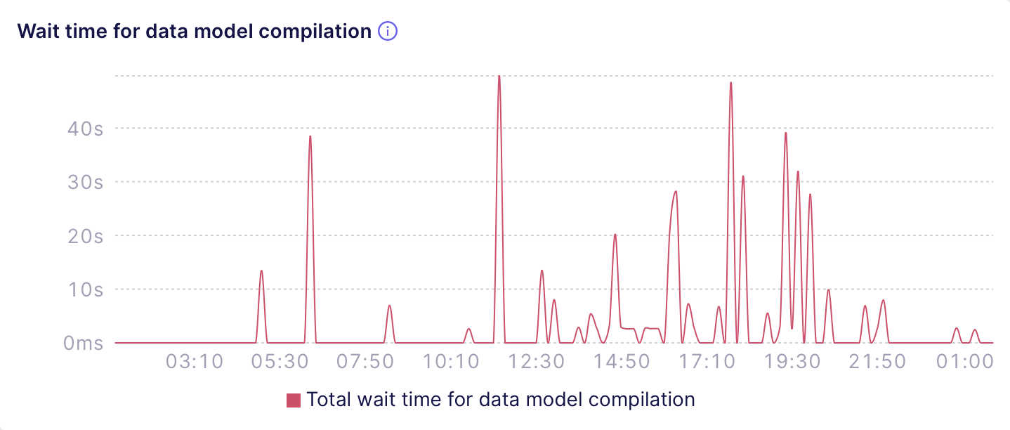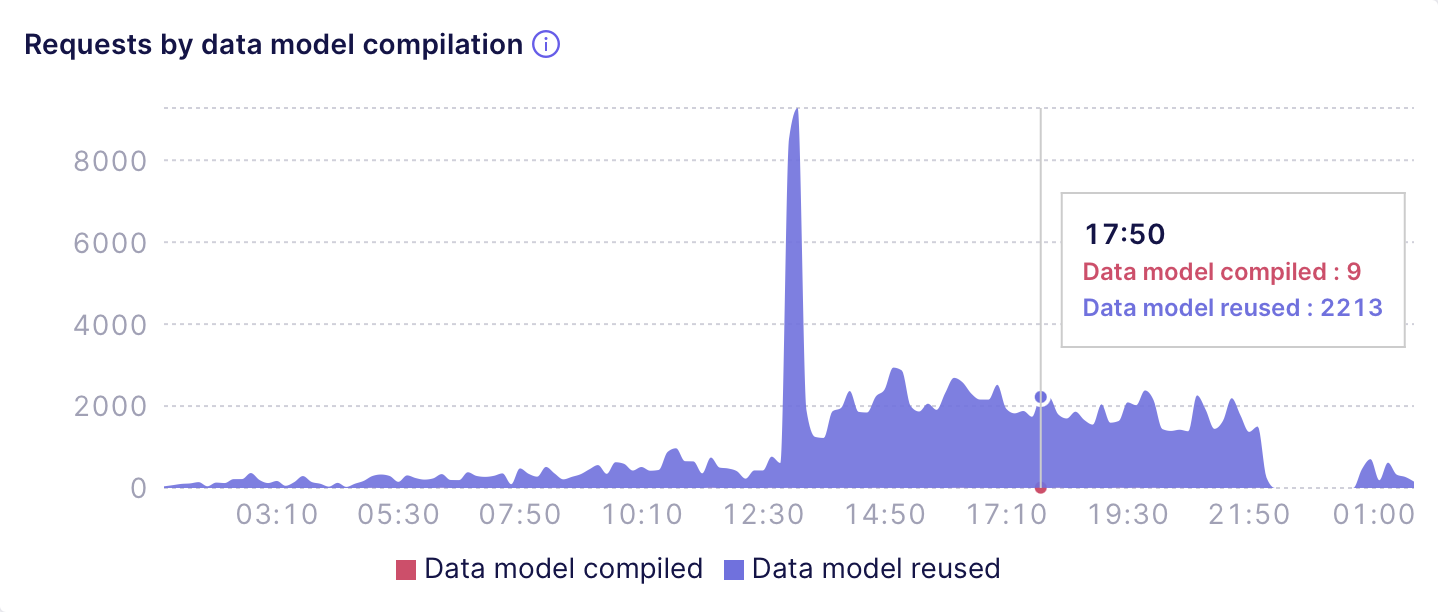 The Requests by data model compilation chart shows the number of API requests that had or had not to wait for the data model compilation. For example, the following chart shows a deployment that only has a tiny fraction of requests that require the data model to be compiled:context_to_app_id), or