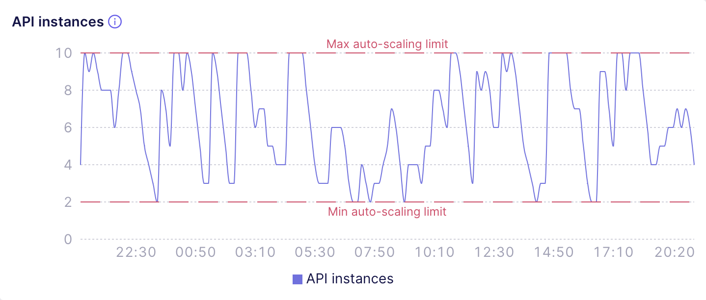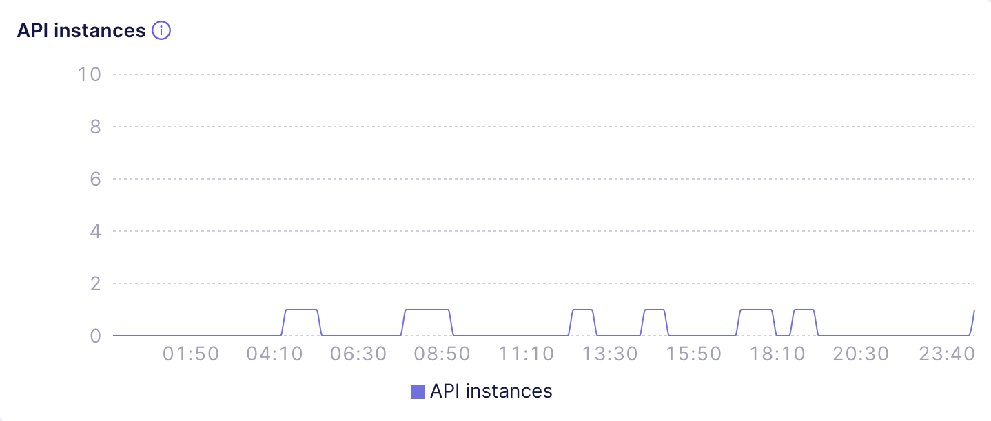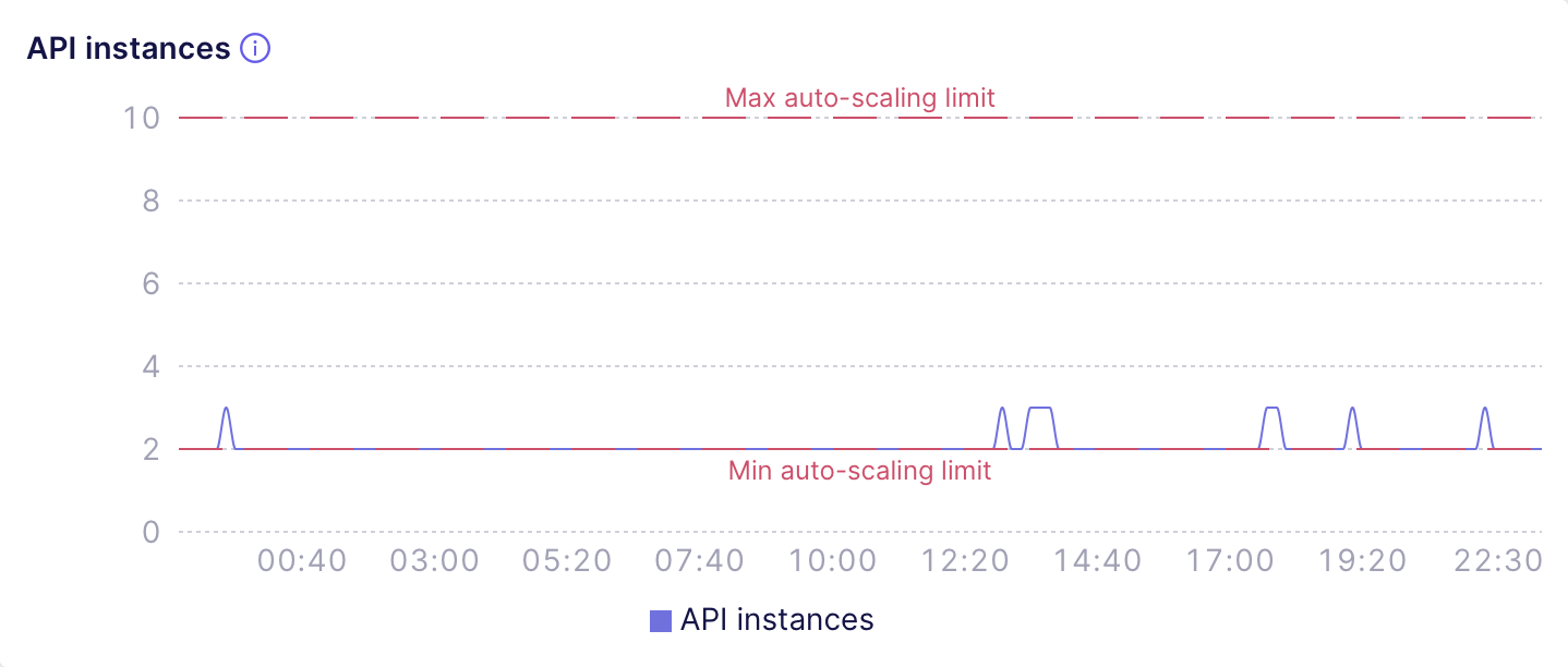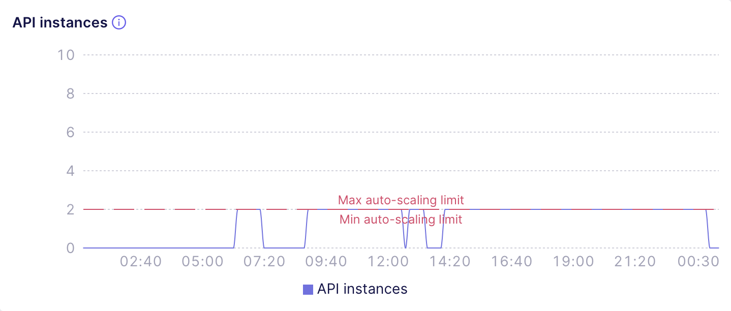 The API instances chart shows the number of API instances that served queries to the deployment. You can use this chart to fine-tune the auto-scaling configuration of API instances, e.g., increase the minimum and maximum number of API instances. For example, the following chart shows a deployment with sane auto-scaling limits that don’t need adjusting. It looks like the deployment needs to sustain just a few infrequent load bursts per day and auto-scaling to 3 API instances does the job just fine:Cache type