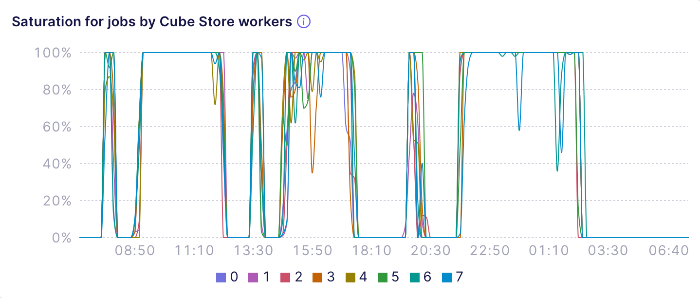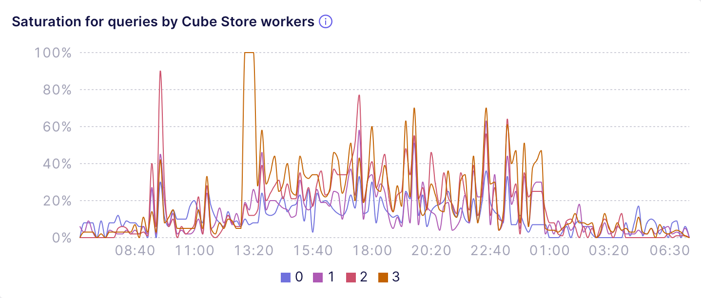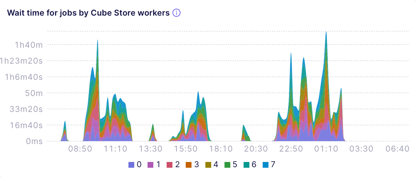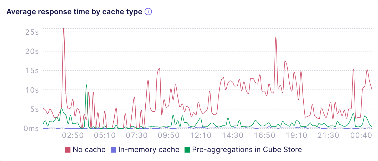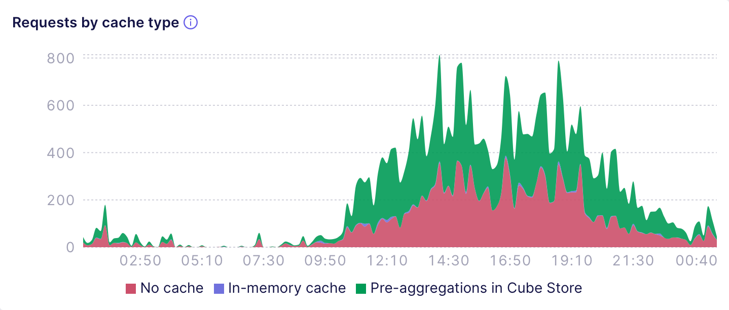 The API instances chart shows the number of API instances that served queries to the deployment. You can use this chart to fine-tune the auto-scaling configuration of API instances, e.g., increase the minimum and maximum number of API instances. For example, the following chart shows a deployment with sane auto-scaling limits that don’t need adjusting. It looks like the deployment needs to sustain just a few infrequent load bursts per day and auto-scaling to 3 API instances does the job just fine:Cache type