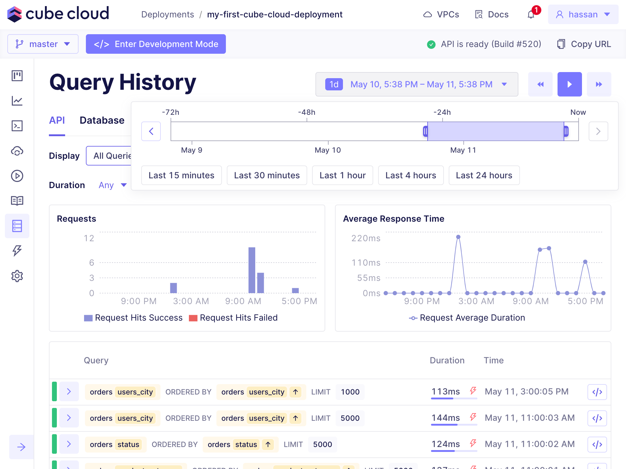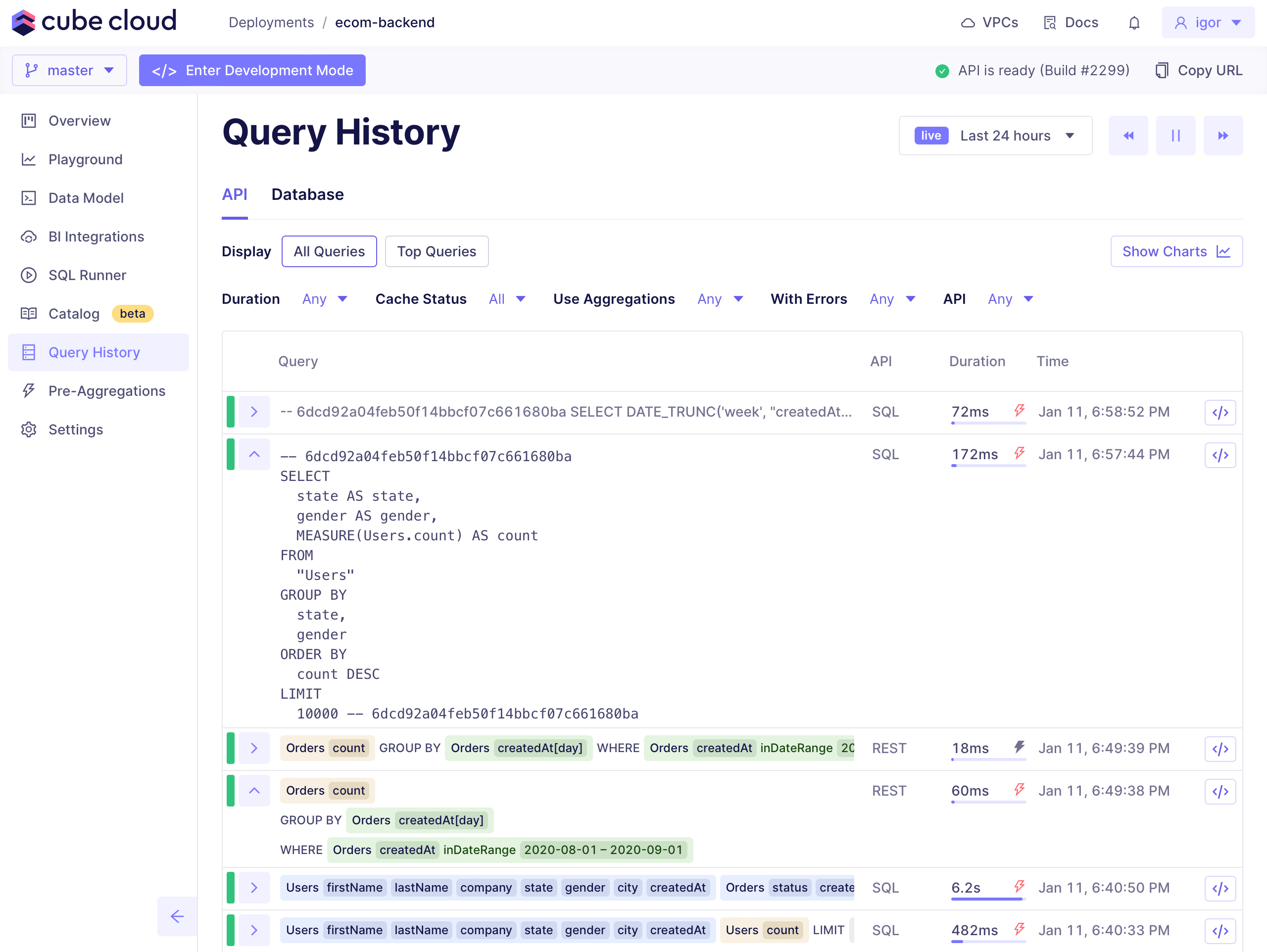 By default, Cube Cloud shows you a live feed of queries made to the API and connected data sources. You can navigate throughout the query history by using the date picker in the top right corner of the page and selecting a time period:Exploring queries