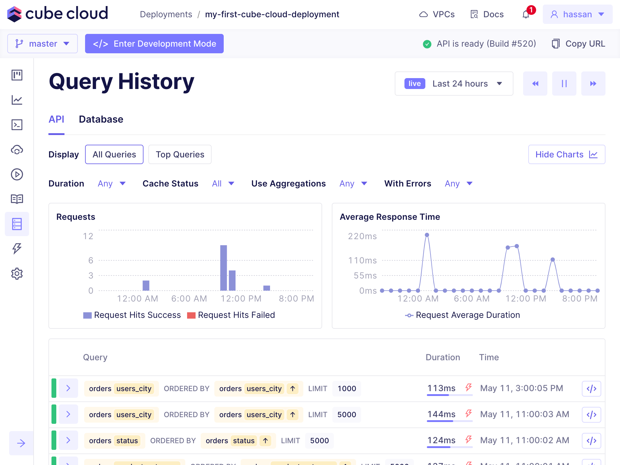 You can switch between queries made to the API and queries made to connected data sources by switching between the API and Database tabs.All queries and top queries