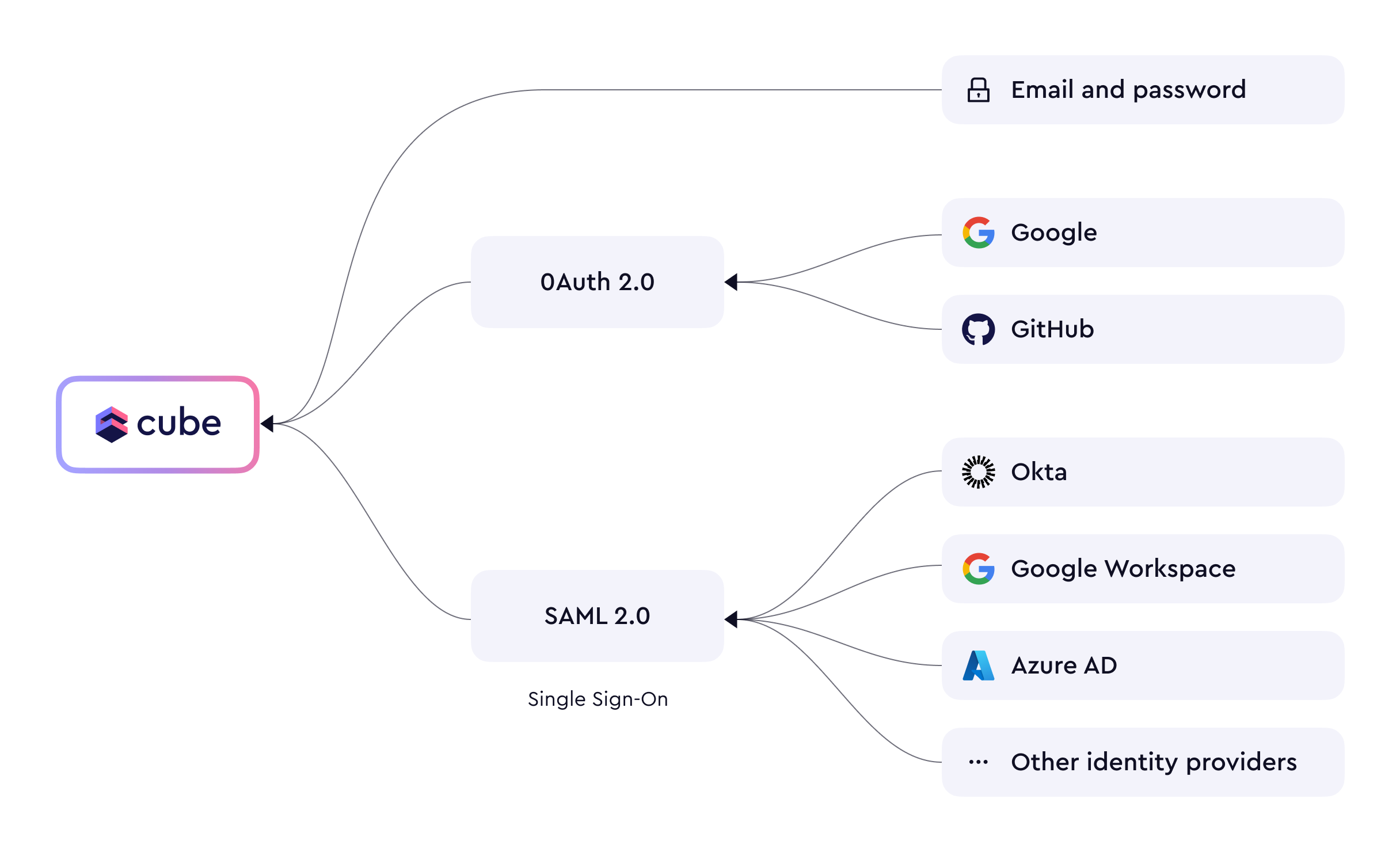 Cube Cloud also provides single sign-on (SSO) via identity providers supporting