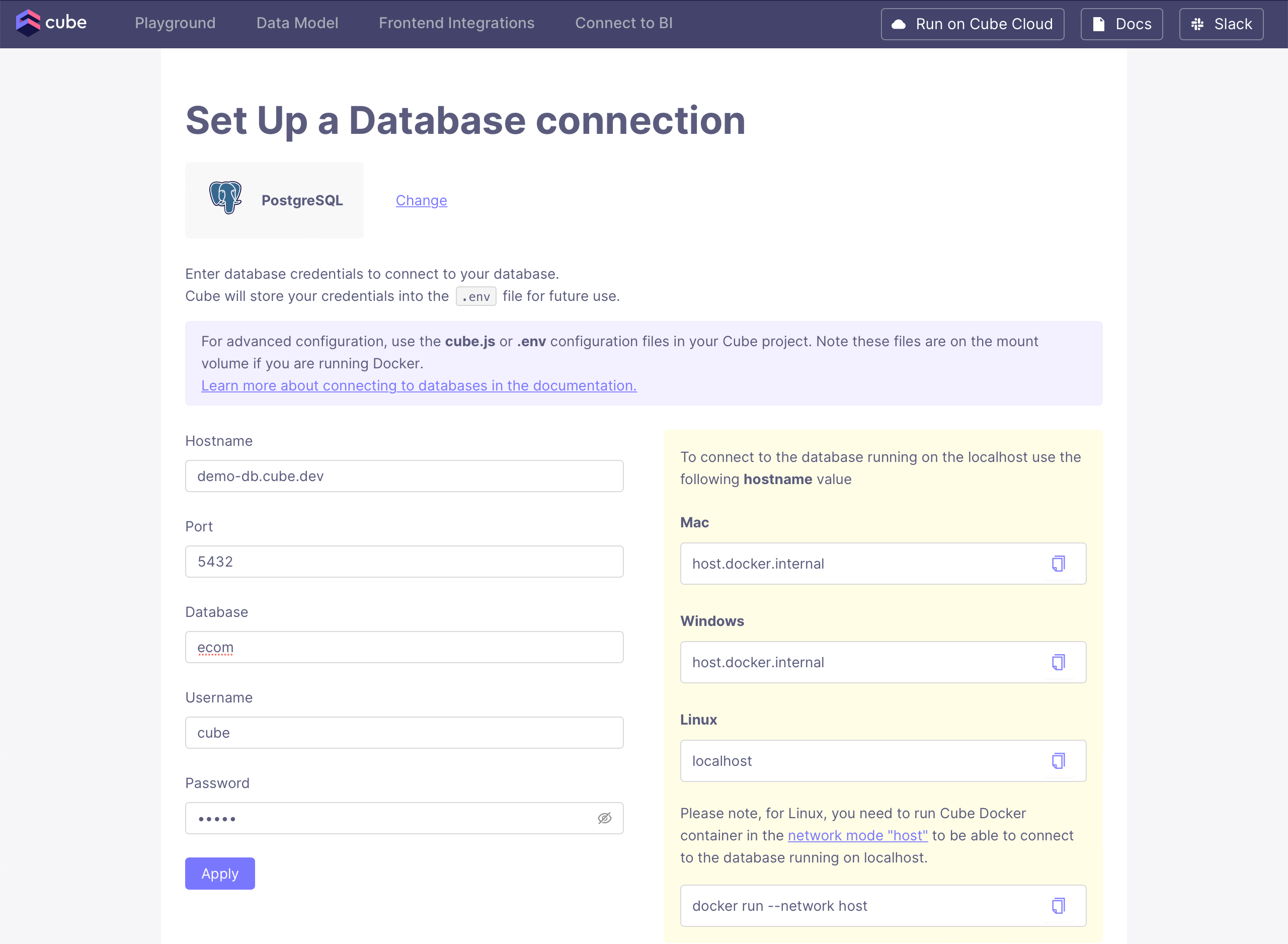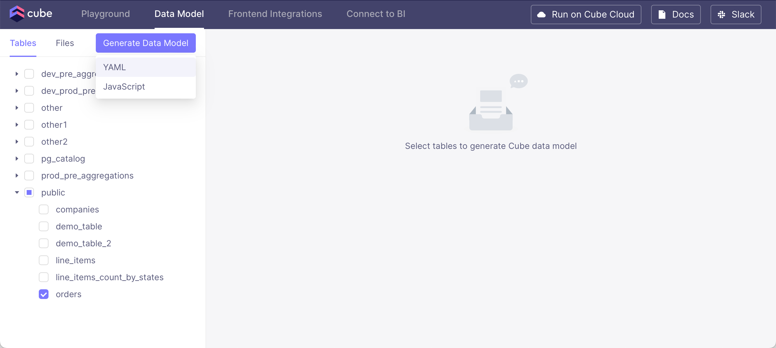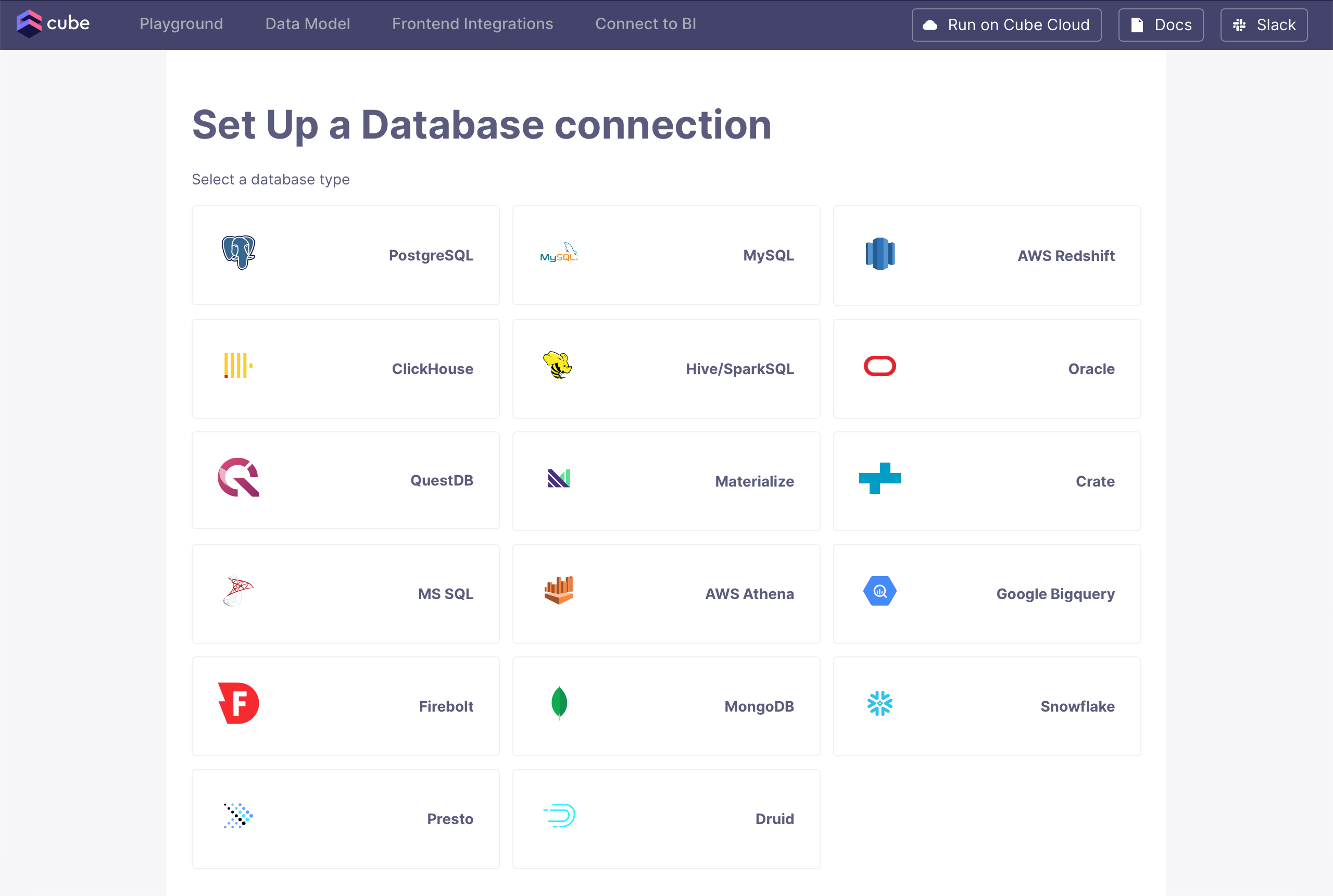 Head to http://localhost:4000 to open the Developer Playground. The Playground has a database connection wizard that loads when Cube is first started up and no.env file is found. After database credentials have been set