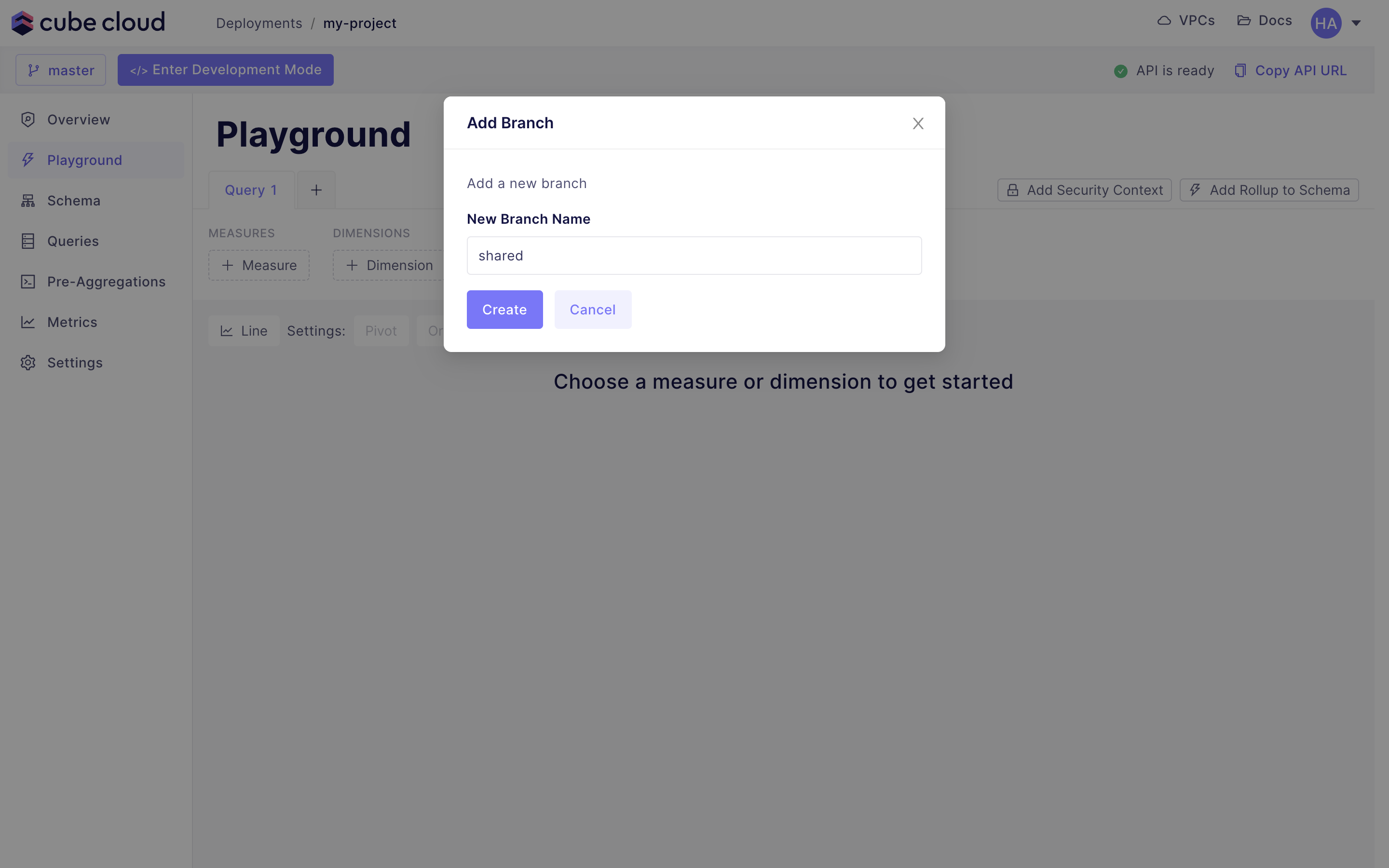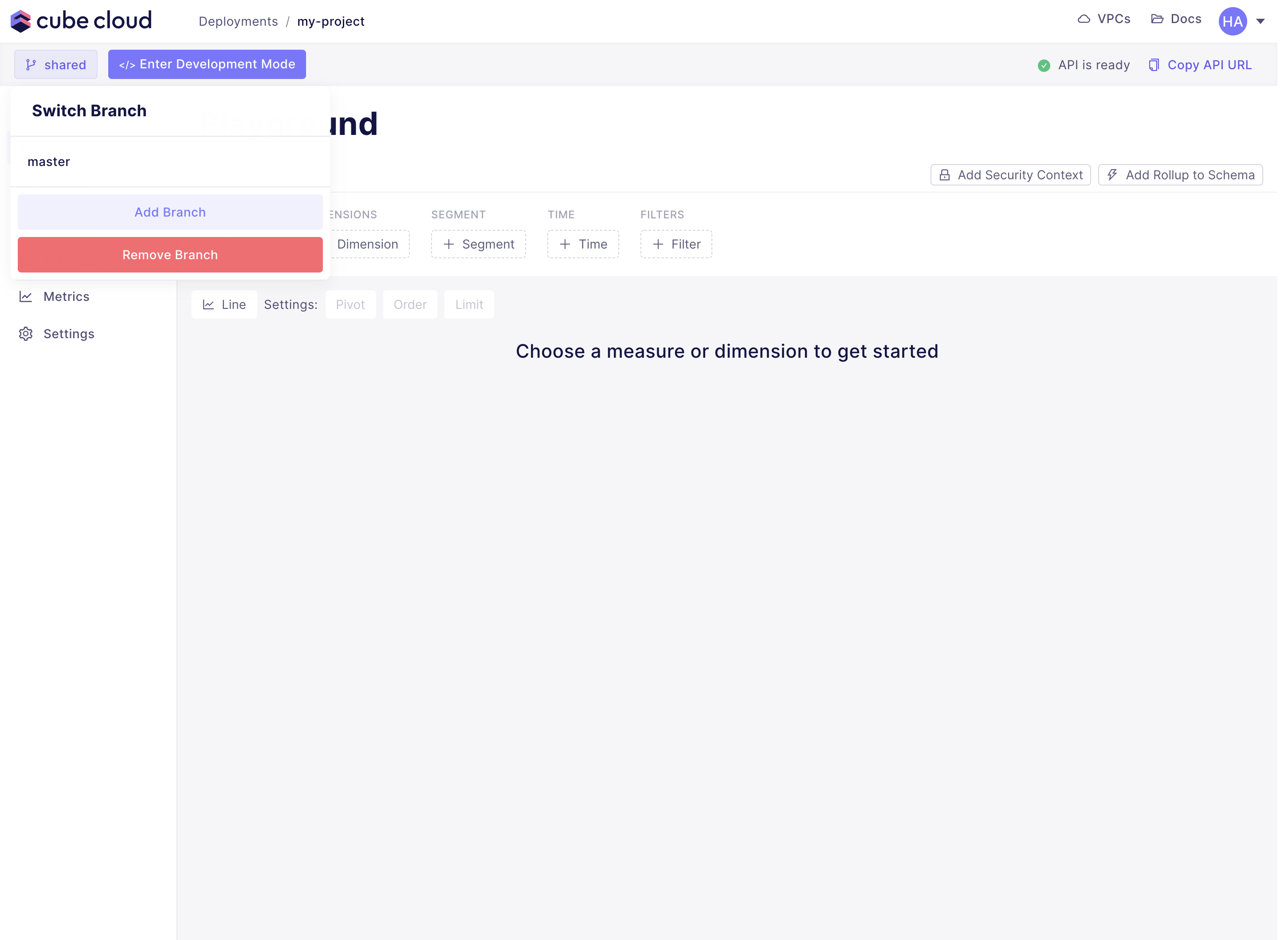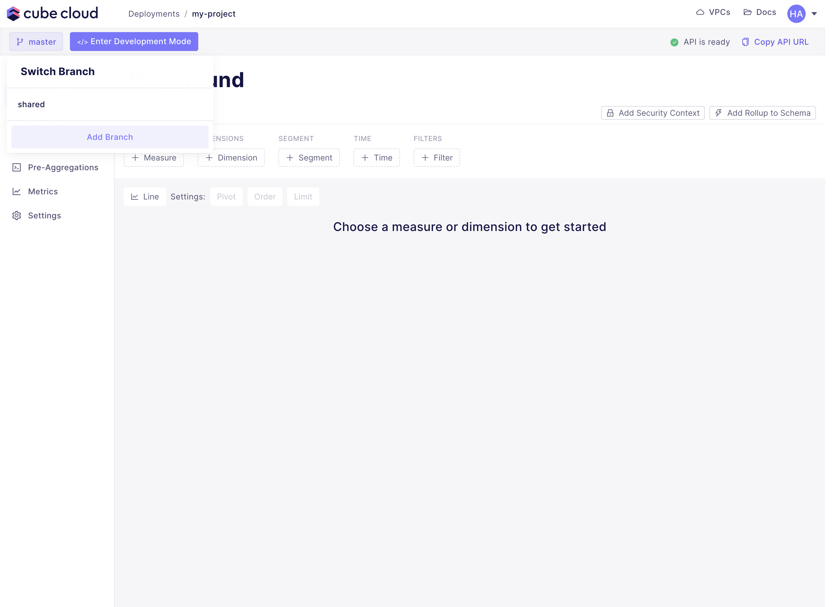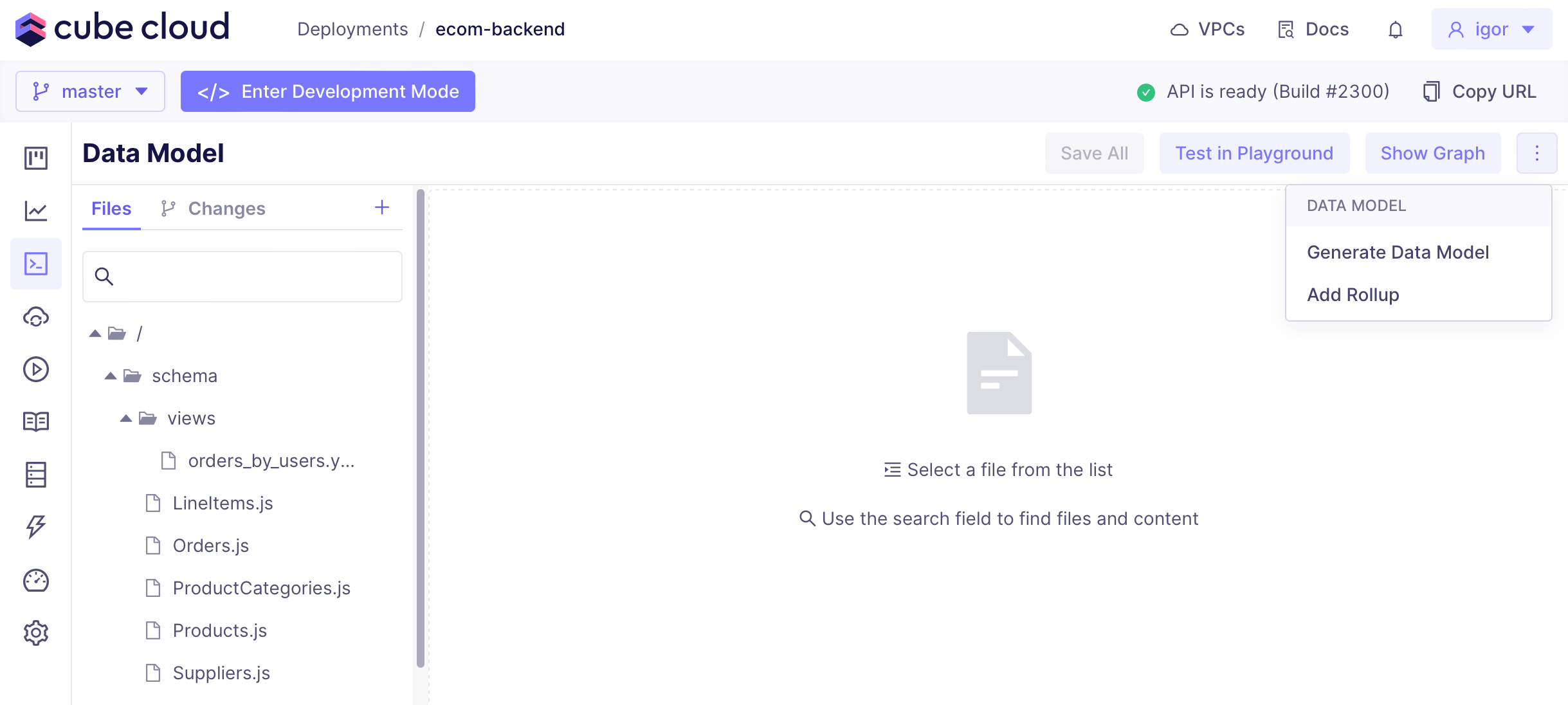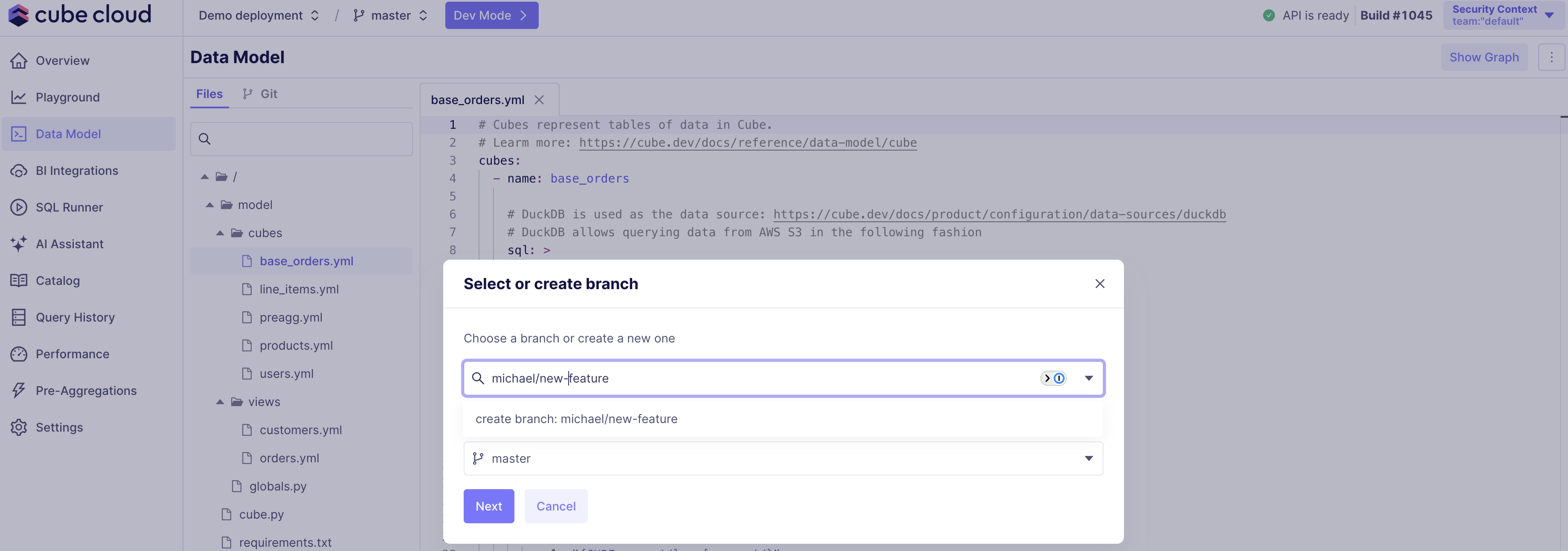 To add more Git branches to your Cube Cloud deployment and/or switch between them, click the branch name in the status bar:Generating data model files