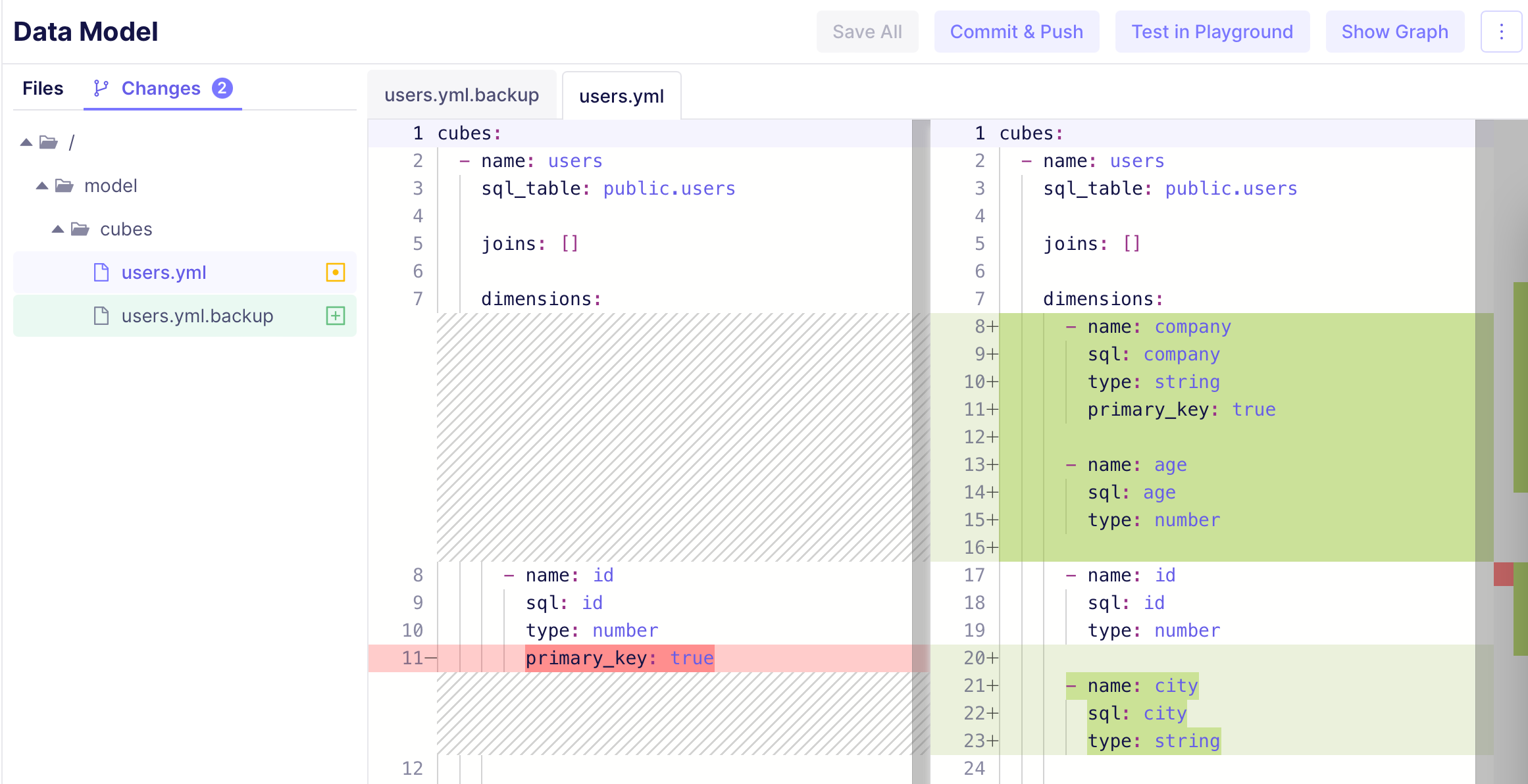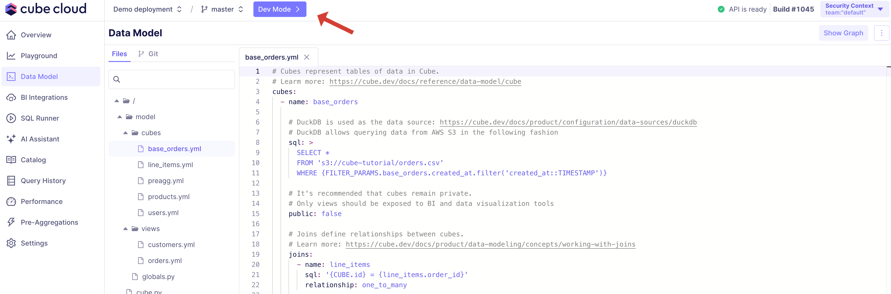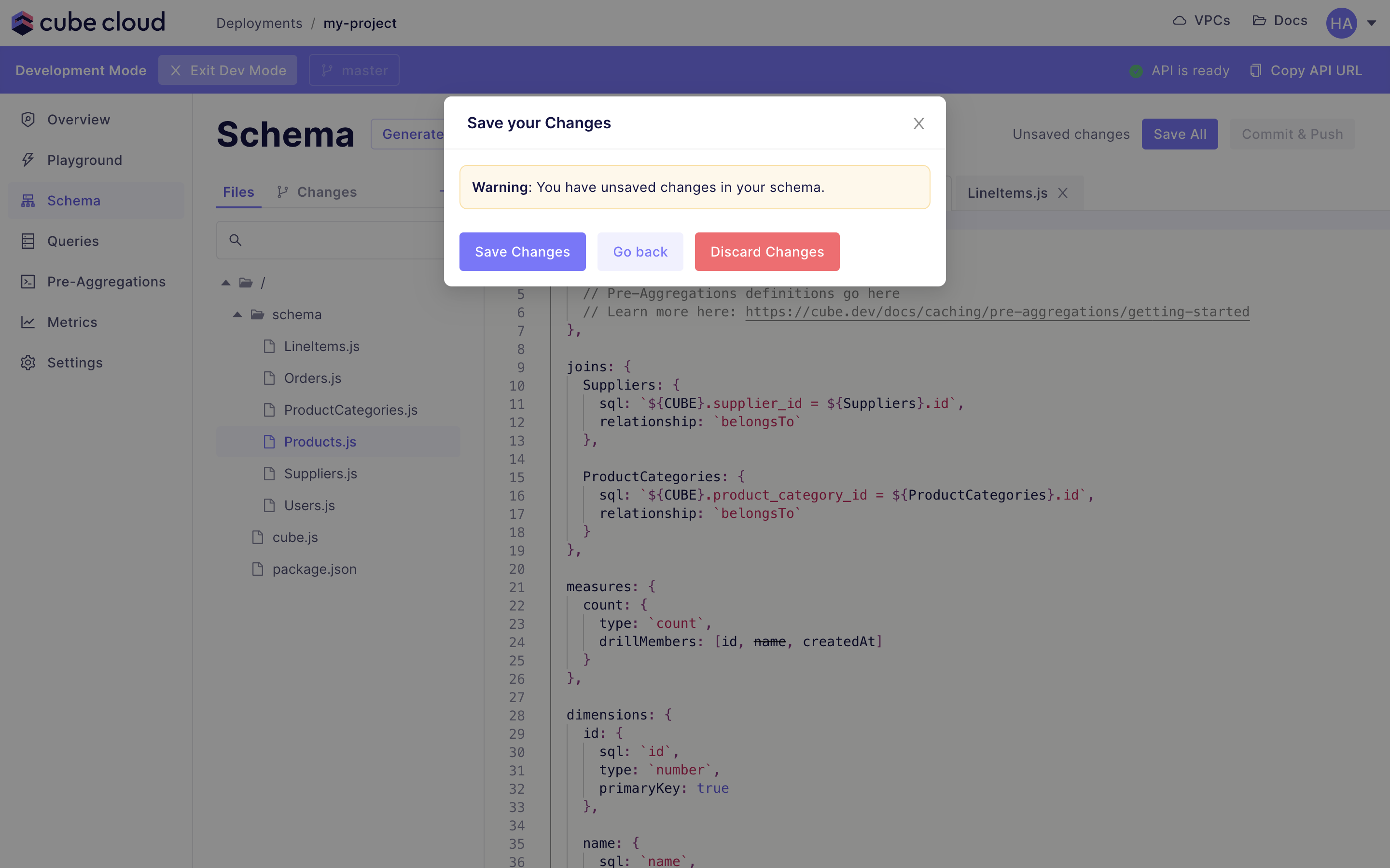 In development mode, you can safely make changes to your project without affecting production deployment. Development mode uses a separate Git branch and allows testing your changes in Playground or via a separate API endpoint specific to this branch. This development API hot-reloads your data model changes, allowing you to quickly test API changes from your applications. To enter development mode, navigate to the Data Model screen and click Dev Mode.Git integration