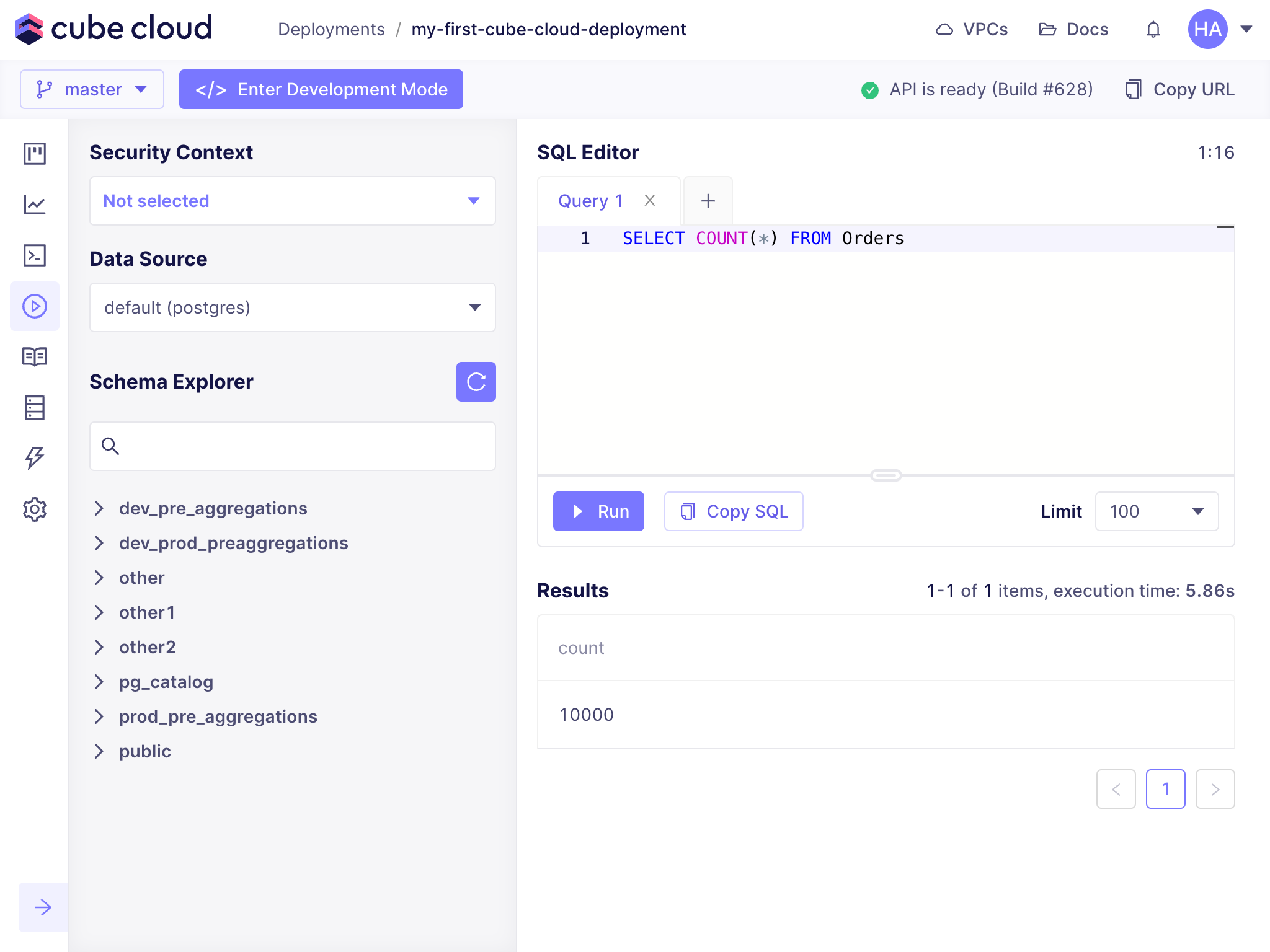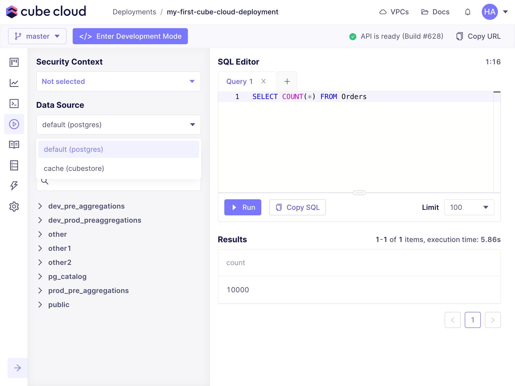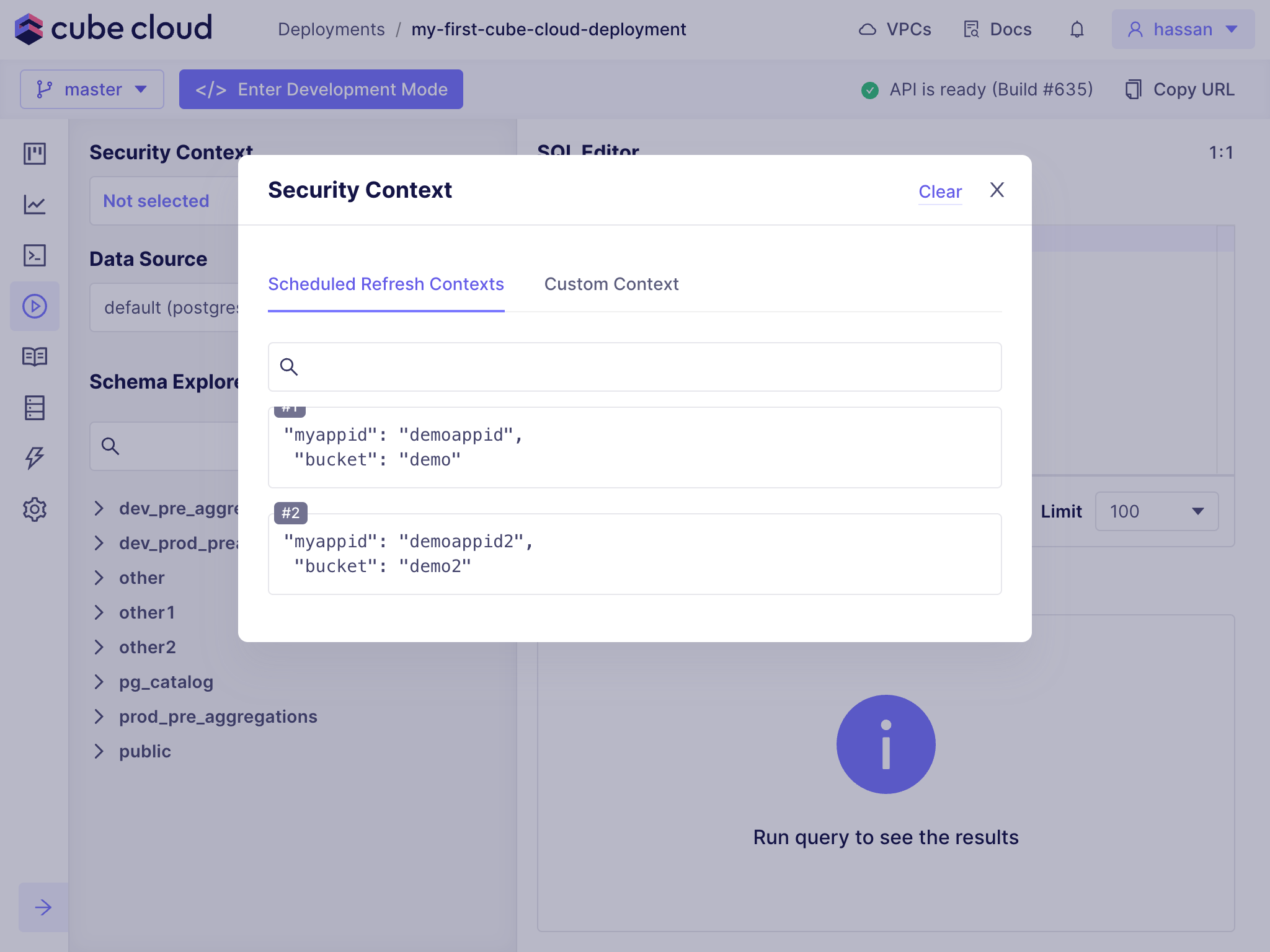 The SQL Runner also allows executing queries against configured data sources using a specific security context, which is particularly convenient for debugging queries in a multi-tenant configuration. The SQL Runner can be configured to use predefined security contexts fromscheduledRefreshContexts in the cube.js