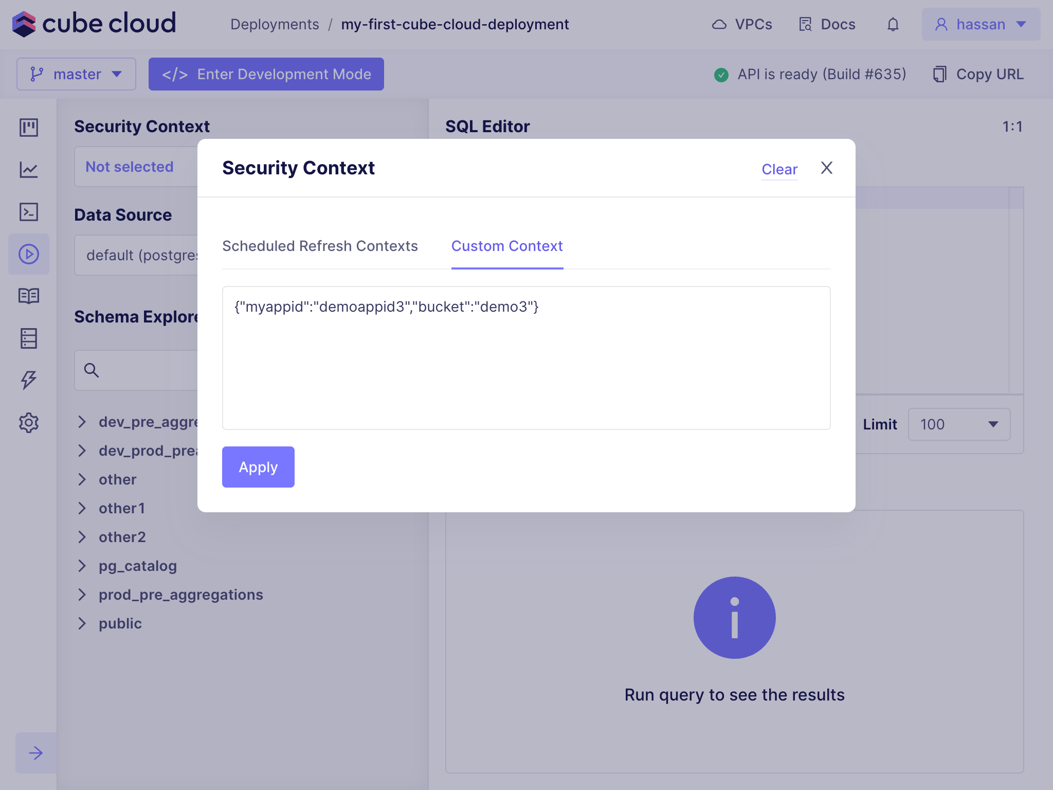 The SQL Runner also allows providing an ad-hoc security context as a JSON string. From the same dropdown under Security Context, click the Custom Context tab and enter a valid JSON string and click Apply:Viewing schema details