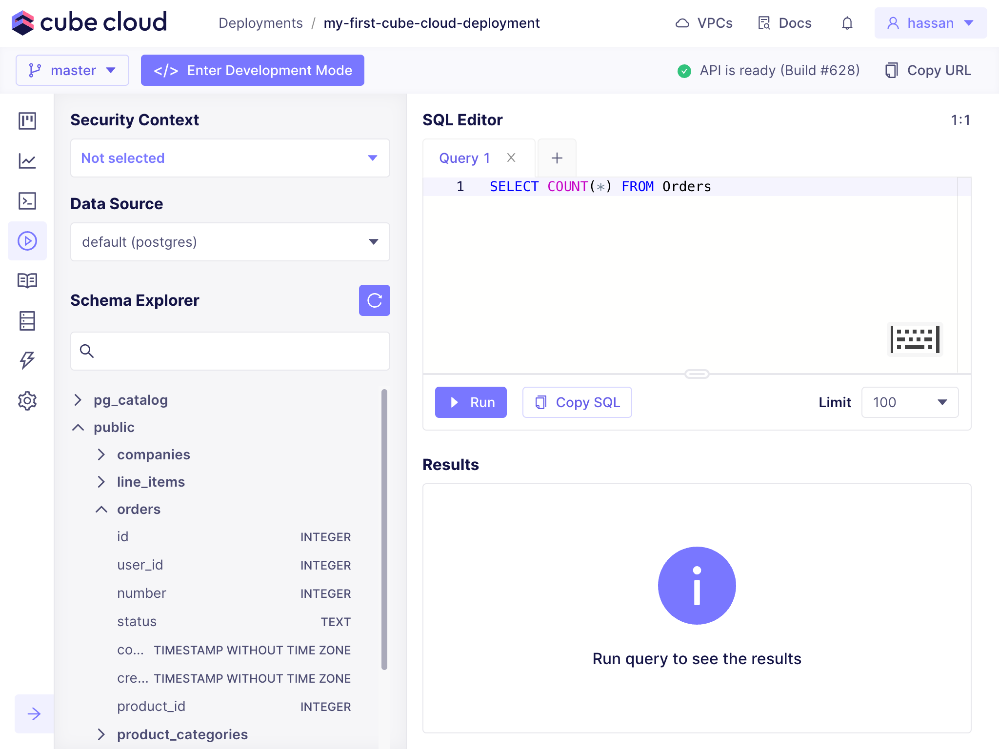 The Schema Explorer allows you to view details of the data source’s schema, including tables and their columns and types. This is useful for ensuring that properties of data models match the underlying schema (i.e. anumber property