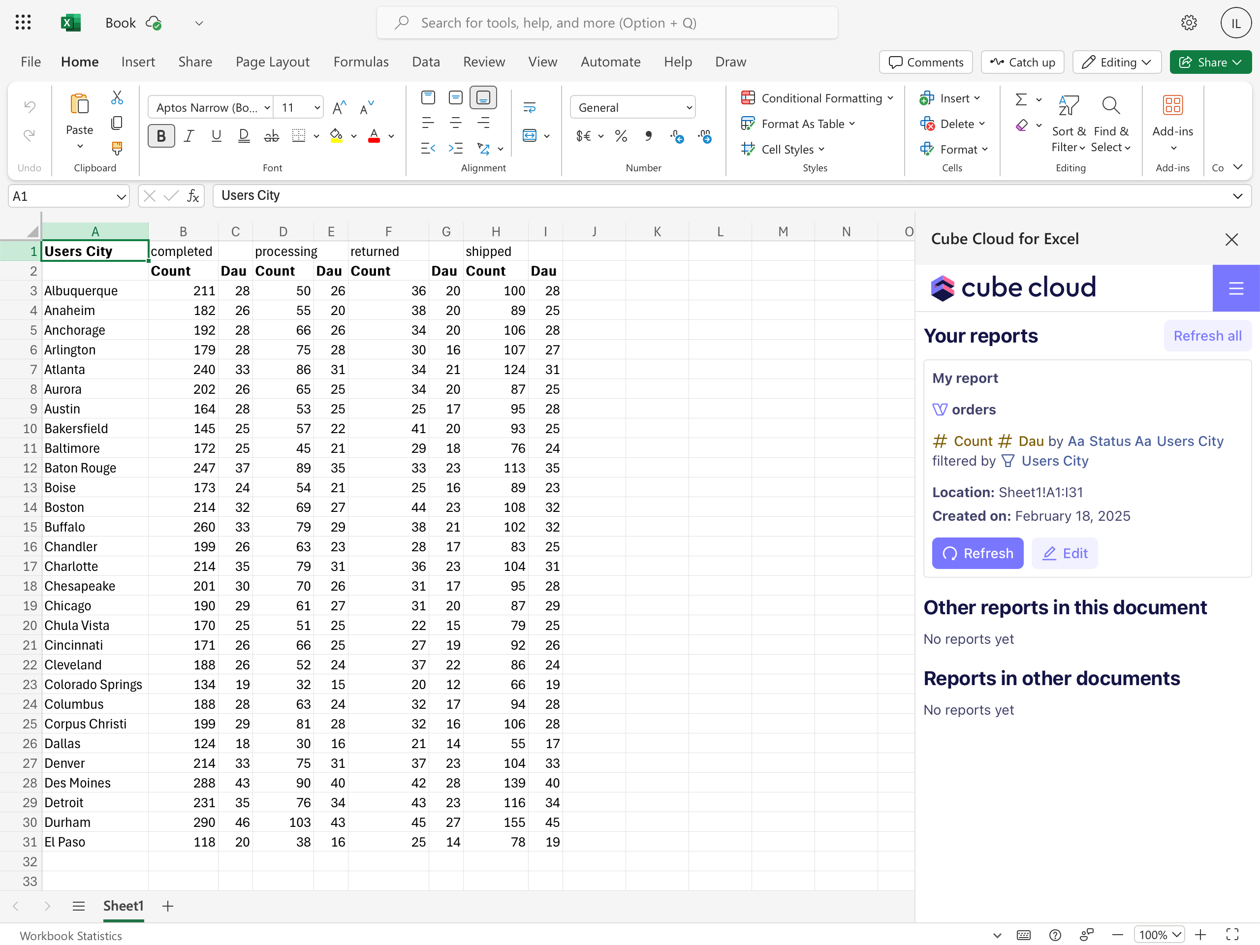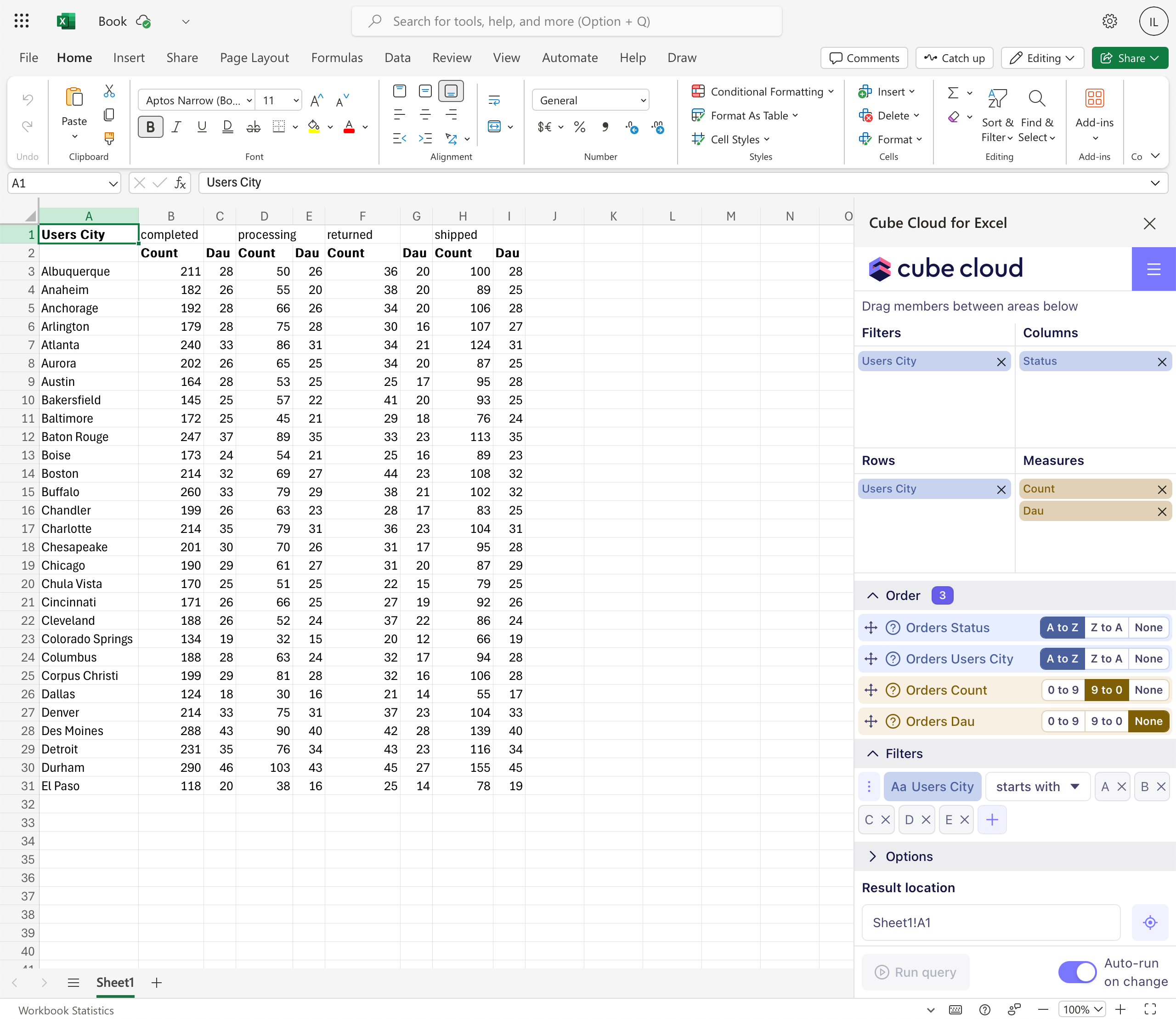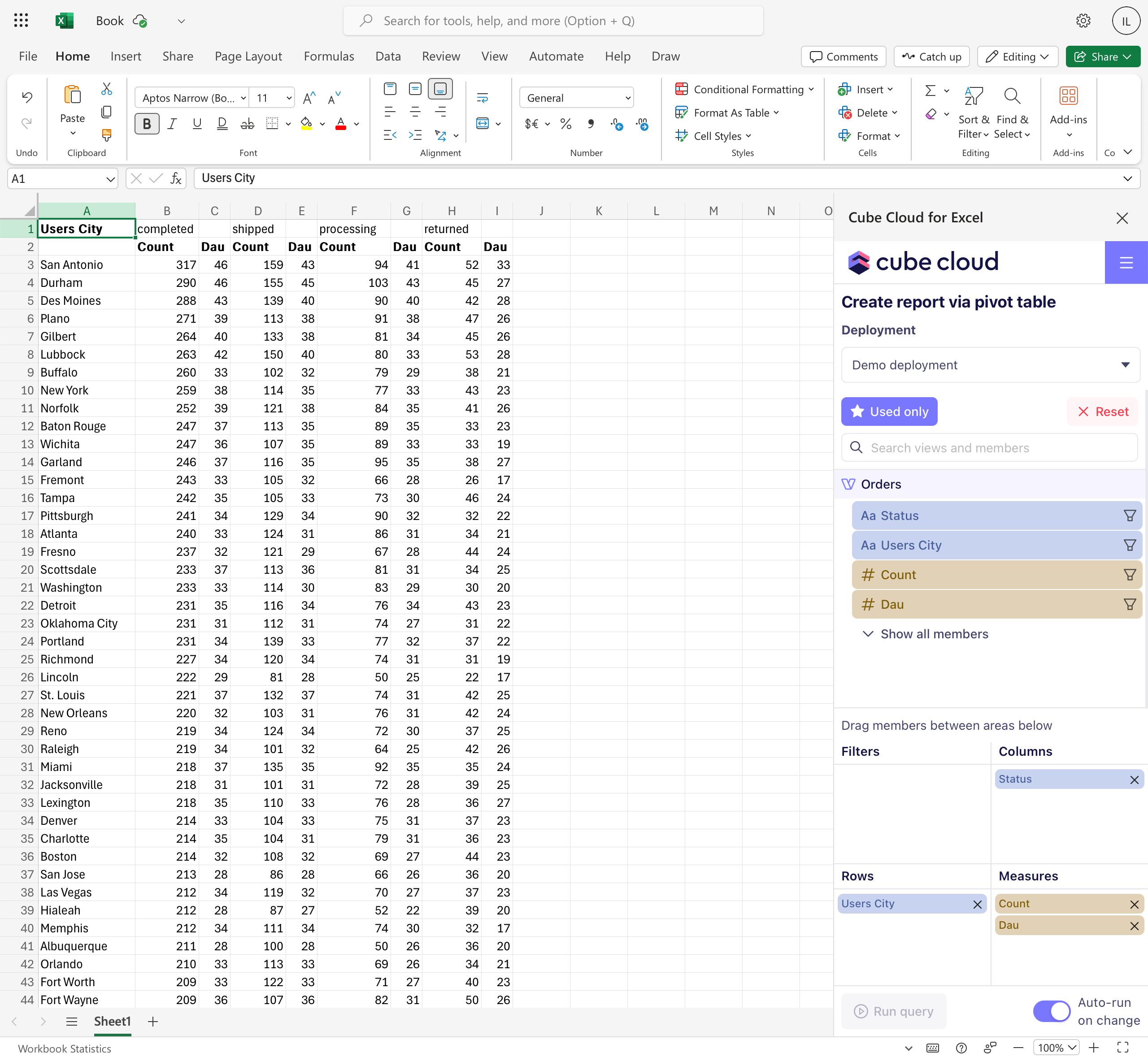 To create a report, go to the add-in menu and click Create report via pivot table. Then, select a Cube Cloud deployment from the drop-down. Finally, you can start building a query by selecting a view and its members in the UI that looks and feels like Playground.Cube Cloud for Excel works only with views, not cubes.