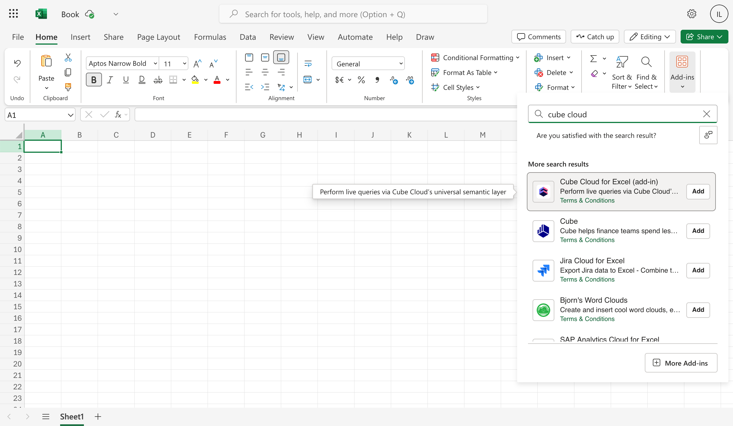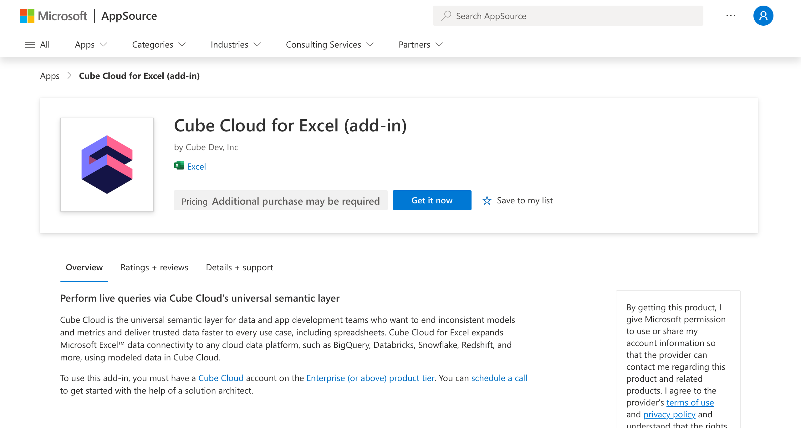 You have to install Cube Cloud for Excel into your Microsoft 365 organization. To do so, navigate to its page in the Microsoft AppSource and click Get it now:Cube Cloud for Excel (add-in) and click Add: