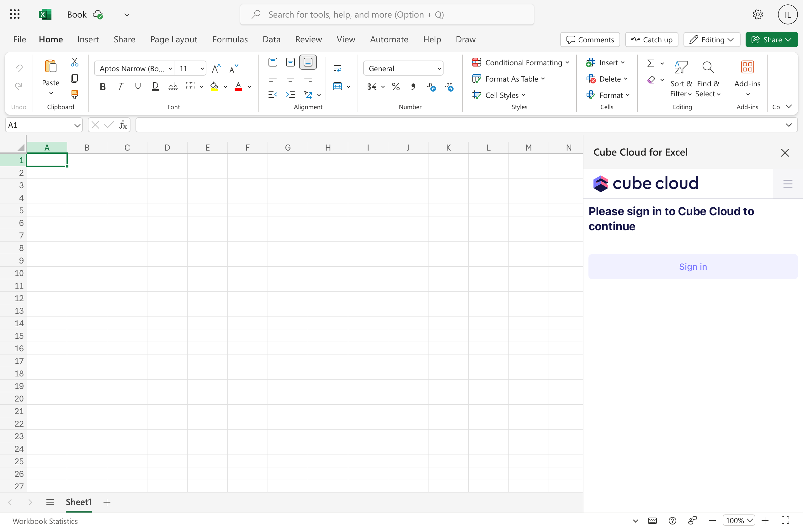 You need to authenticate Cube Cloud for Excel to retrieve data from Cube Cloud. To do so, open the sidebar by clicking on the Cube Cloud button in the Home ribbon. Then, click Sign in.Access Granted message, close the modal window.