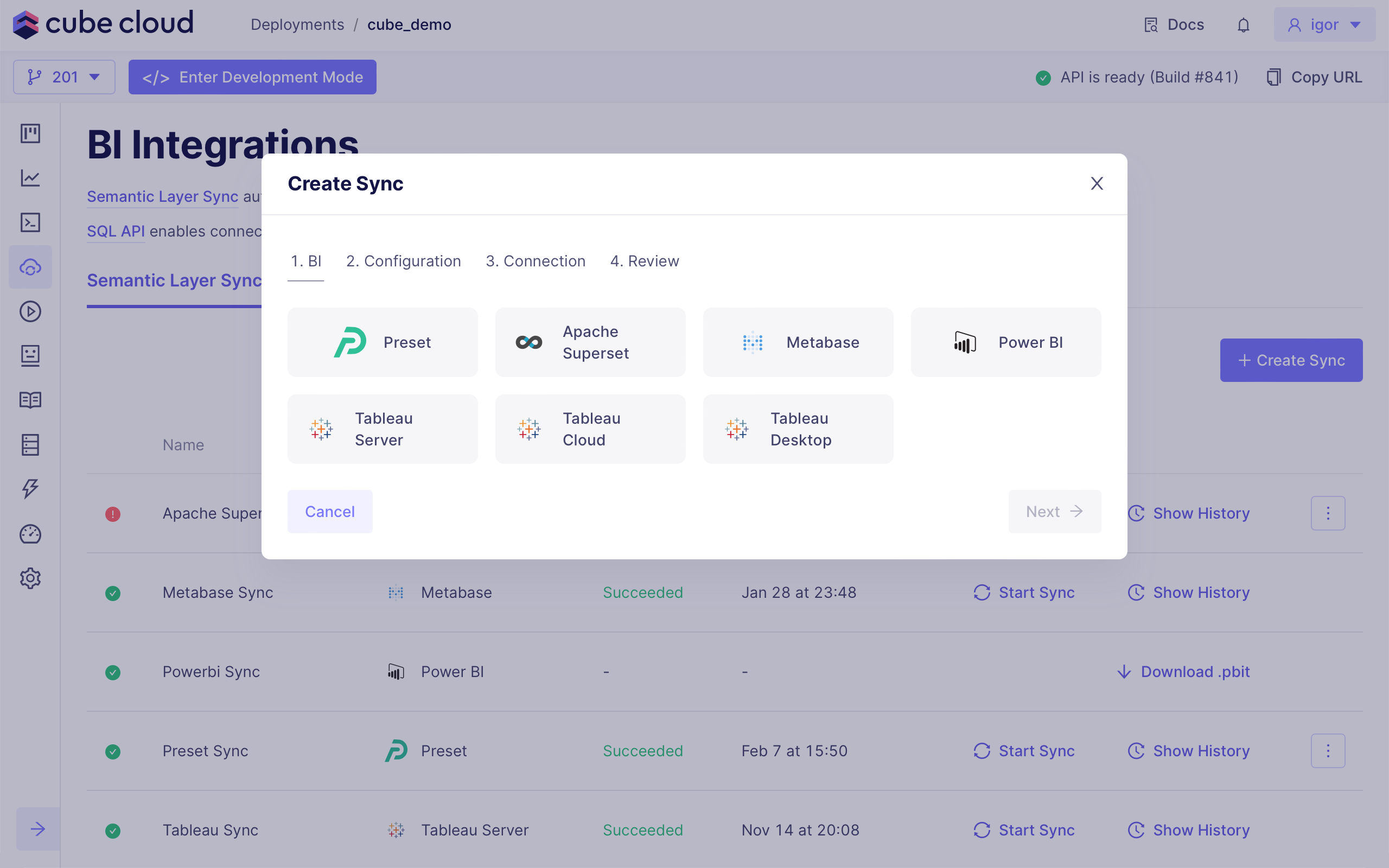 to enter the user name and password for Cube Cloud. You can find them at the SQL