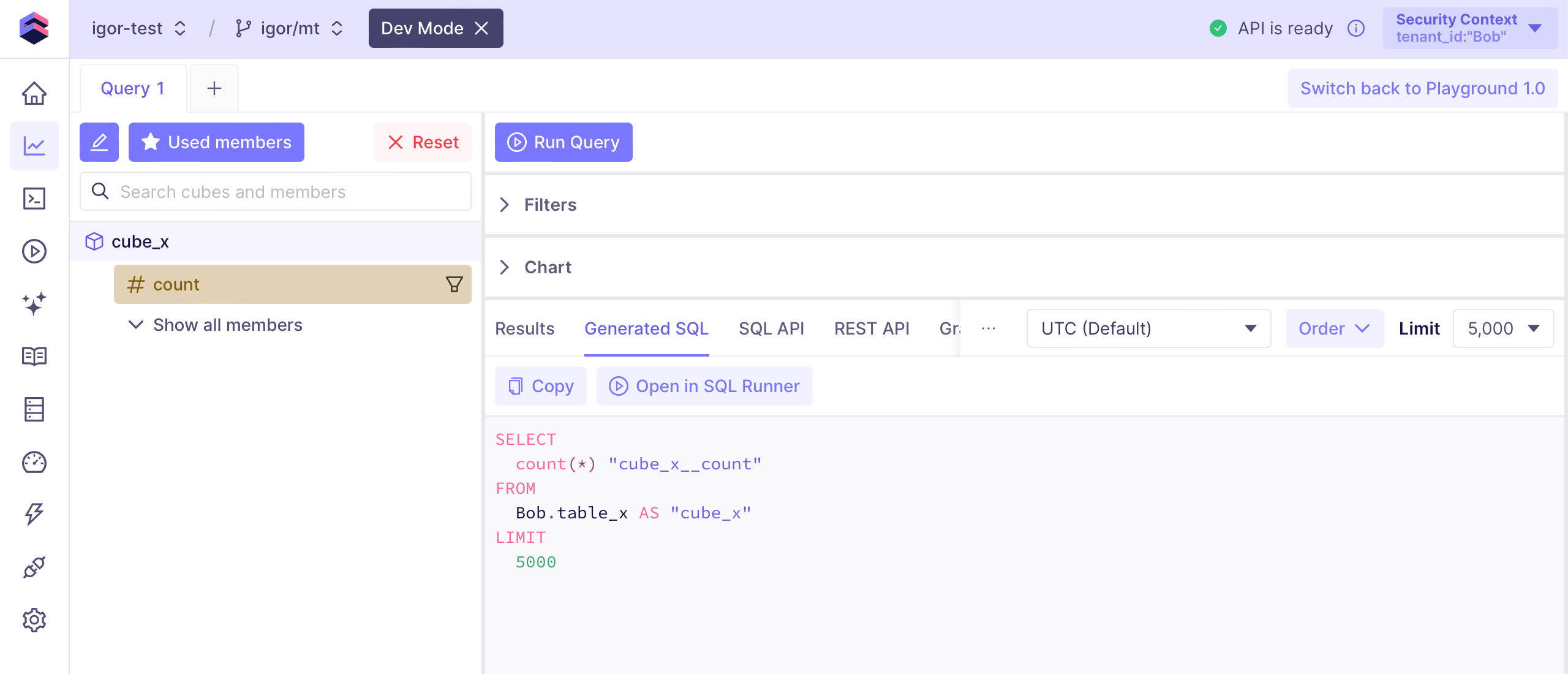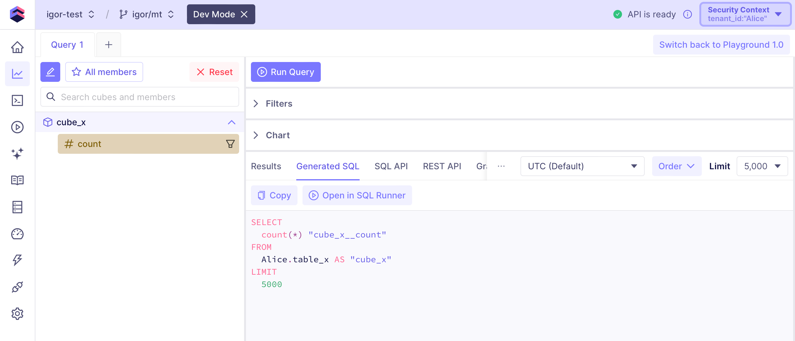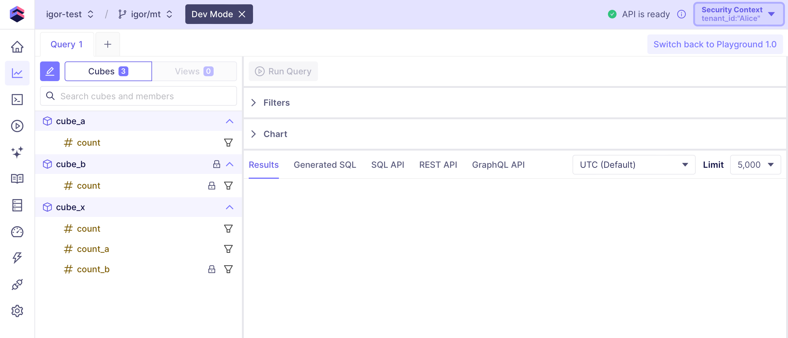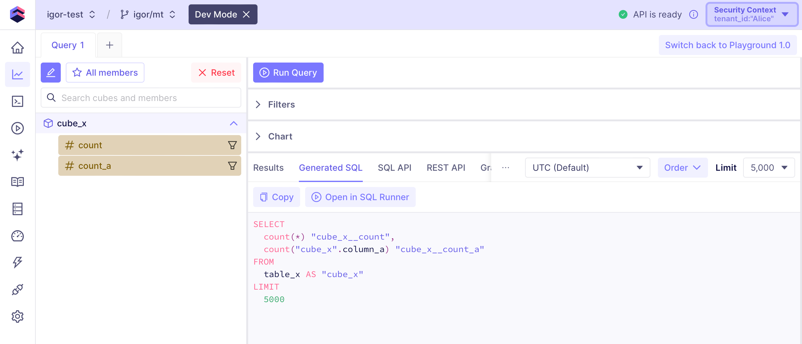 A more advanced way to customize the data models is by using dynamic data models. It allows to create fully customized data models for each tenant programmatically. With the following data model,cube_x will have the count_a measure for