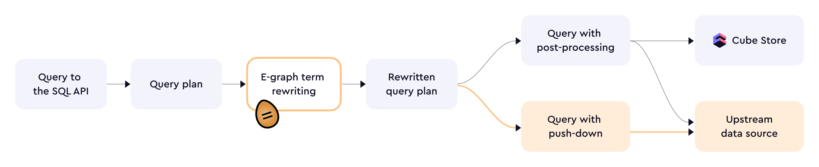In the SQL API, each cube or view from the data model is represented as a table. Measures, dimensions, and segments are represented as columns in these tables. SQL API can execute regular queries, queries with post-processing, and queries with pushdown that can reference these tables and columns. Under the hood, the SQL API uses Apache DataFusion as its query engine. Itβs responsible for query planning and execution. As part of query planning, the SQL API also uses egg (an e-graph term rewriting library) to analyze incoming SQL queries and find the best query plan out of a wide variety of possible plans to execute.| Query type | In-memory cache | Pre-aggregations | SQL support |